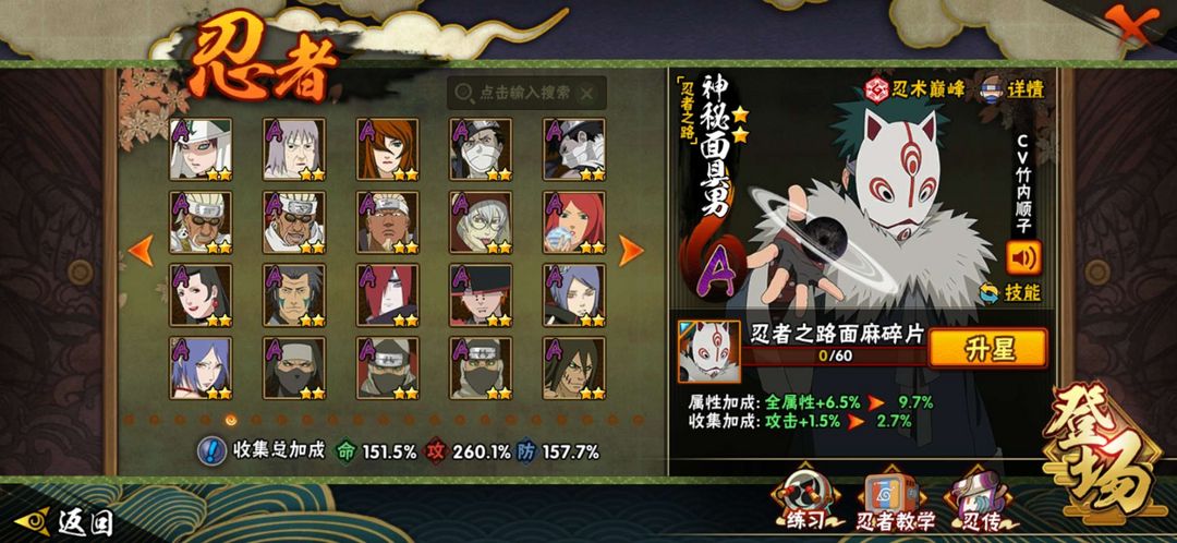 装备描述:51S 60A 299忍者 宇智波止水「新春限定」/蝎 「绯流琥」/佩恩·六道 「漂泊浪客」/烈斗 「初代目风影」/神秘面具男 「红夜之刃」/宇智波斑 「秽土转生·解」/自来也 「传说中的三忍」/波风水门「秽土转生」/千手柱间 「木叶创立」/宇智波止水 「须佐能乎」/漩涡鸣人 「九喇嘛连结」/漩涡鸣人 「暴怒·第六尾」/宇智波斑「白面具」/宇智波带土「忍界大战」/三代目风影 「秽土转生」/宇智波佐助 「永恒万花筒」/佩恩·天道「超」/旗木卡卡西 「须佐能乎」