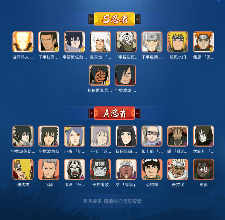 装备描述:骨架 死二 黄猿 紫狗 解斑 创立柱间 新春小南 鹰佐 晓蛇 红面具 许多好玩的18元c忍 八级霸体