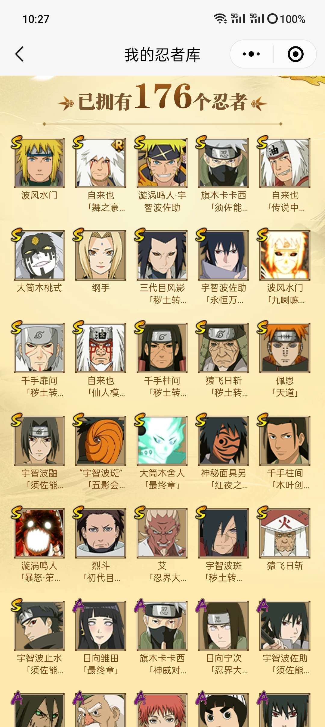 176个忍者 26s 1540w 可用来带90/130团本 阴水门+仙人巳月已秒 五影带土已出