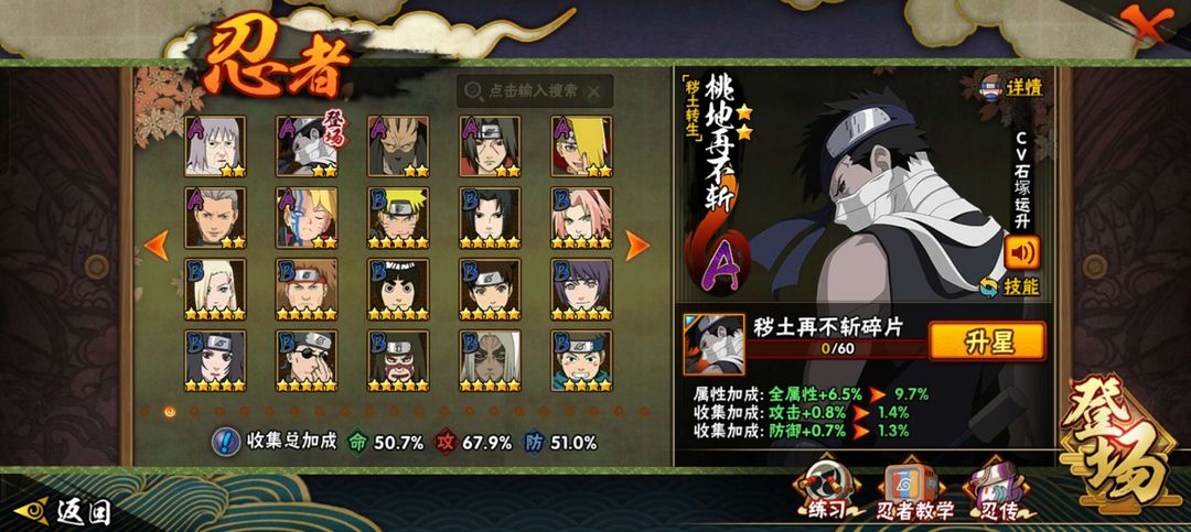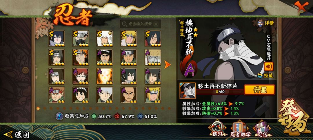 装备描述:7S⭐20A⭐百战鼬⭐死门凯⭐须佐卡卡西⭐须佐佐助⭐植物人⭐舍人