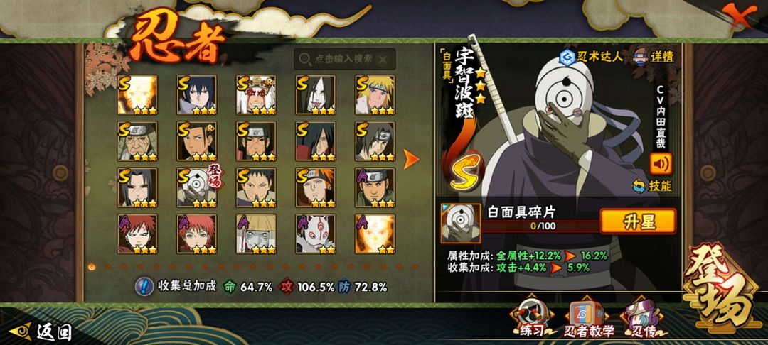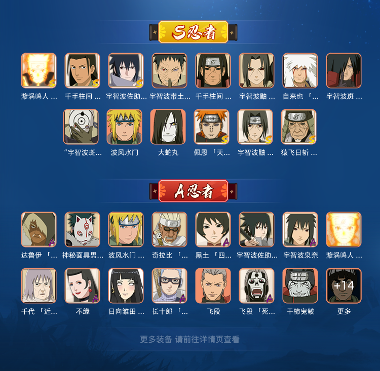 装备描述:14s✨30a✨182忍✨忍战带土✨面麻✨创立柱间✨漂泊带土✨