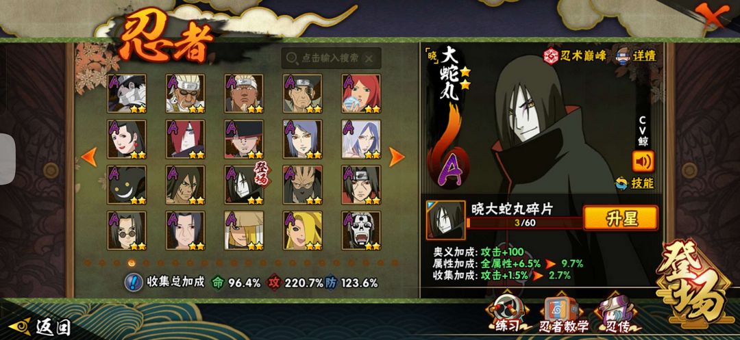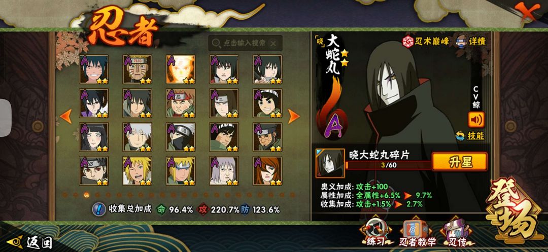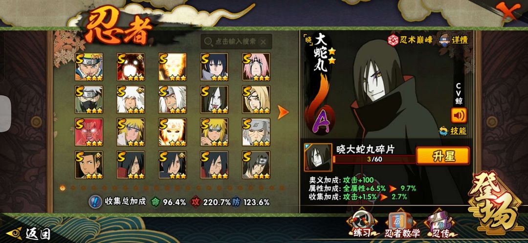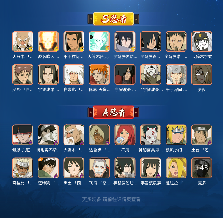装备描述:该账号有九喇嘛鸣人 秽土水门 秽土斑 创立斑 秽土鼬 忍战带土 红夜面具男 四代风影 忍战大野木 大筒木今式 更详细请看图 通灵中有熊猫 砂之守鹤 蛞蝓 蛤蟆龙 乌鸦 蛤蟆健 鲛鲨 蛤蟆仙人 蜃 山椒鱼