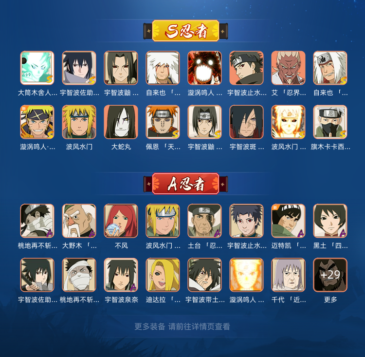 装备描述:17S✨45A✨189忍✨漂泊带土✨六尾鸣人✨五影斑✨新春止水✨漂泊再不斩✨暴怒带土✨最终章舍人