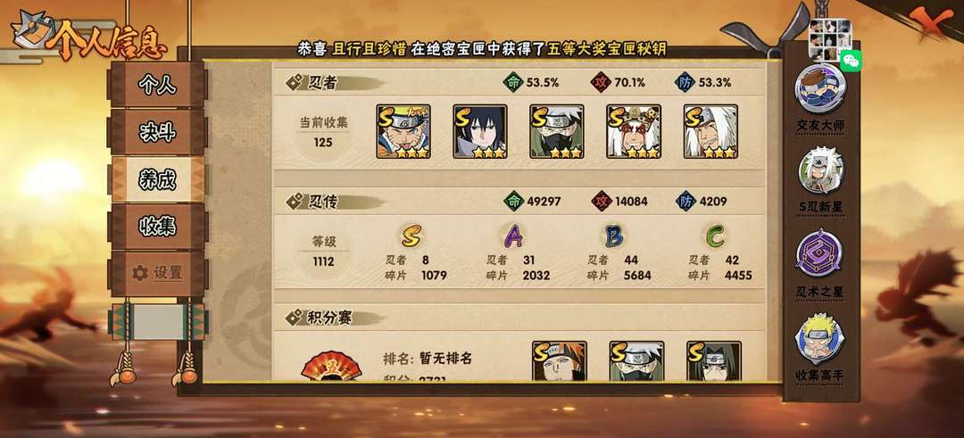 装备描述:8s 31a 侠隐佐助 永恒佐 骨架 鹰佐 须佐卡卡西 面麻 传说自来也 普通人 金鸣