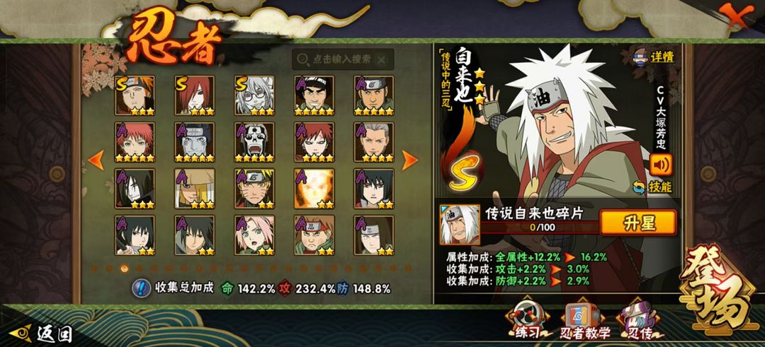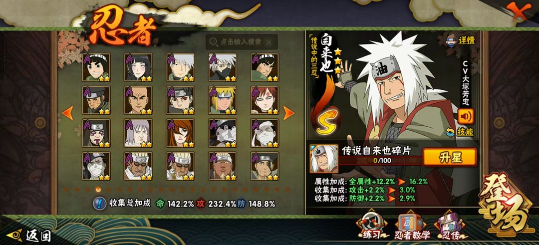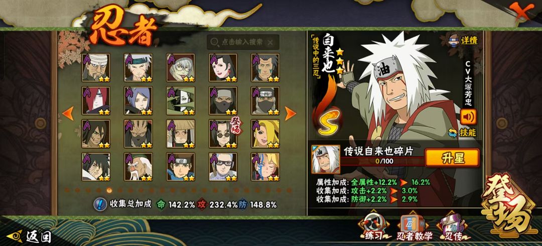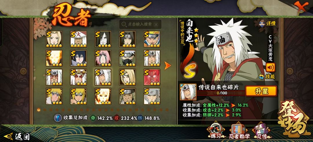装备描述:小胡子 无 金银角 死二 活二 长门 白面 秽土鼬 九喇嘛水门 传说三忍自来也