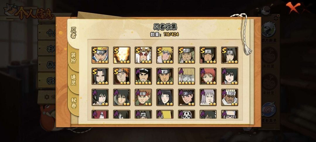 - 忍者总数:118/424,阵容丰富,可玩度高,轻松应对段位赛和娱乐局
