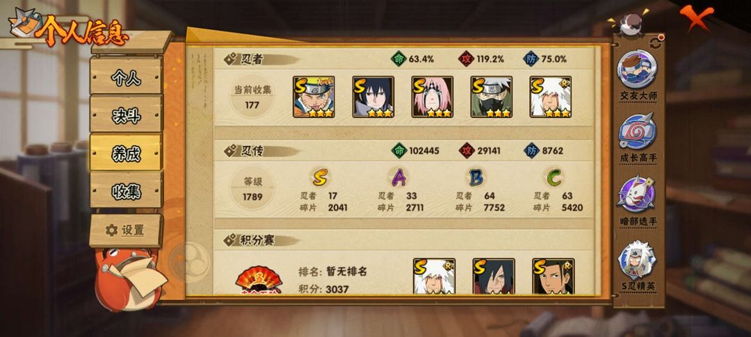 装备描述:红夜带土鼬 传说自来也 忍战樱 万花筒佐助 骨架 万花筒卡卡西