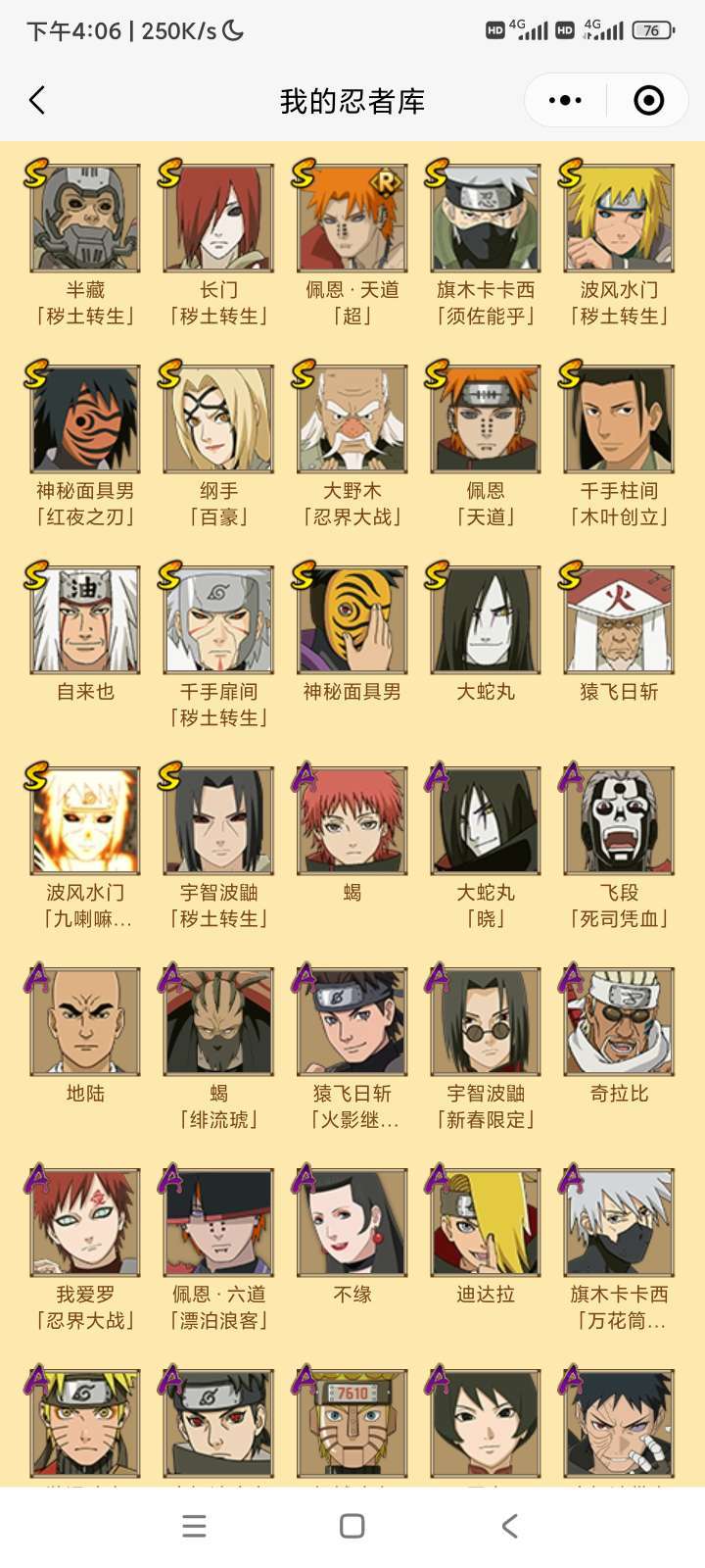 装备描述:全高招s,全高招a,忍法帖山椒鱼半藏,五影带土,大筒木桃矢,无等,新春鼬新春水门漂泊带土漂泊再不斩等