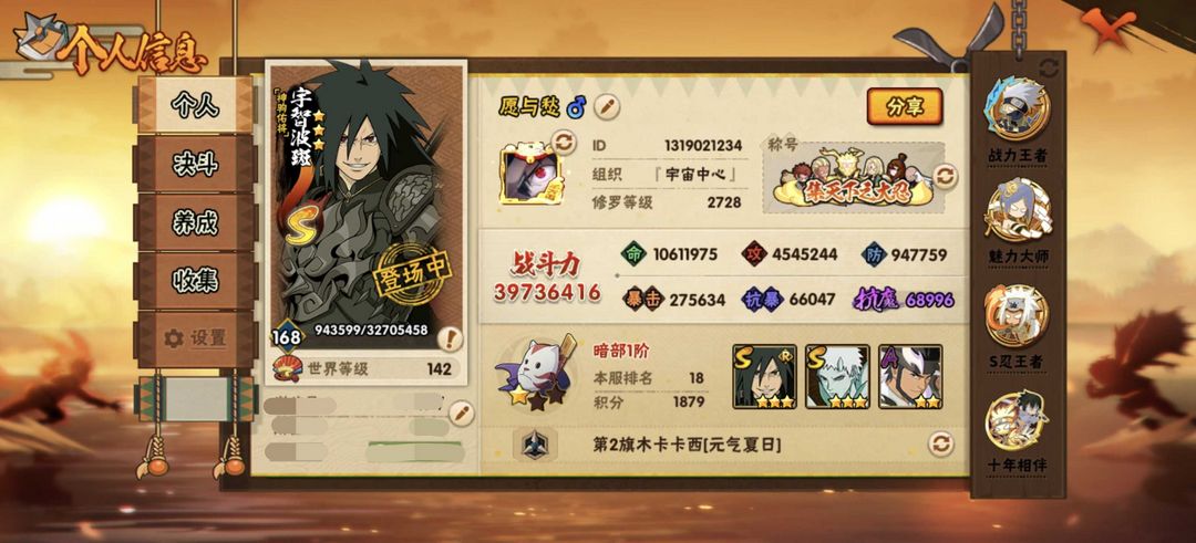 ⭐全忍者⭐全通灵⭐3973W战⭐神驹斑⭐十尾带土⭐神驹阿斯玛⭐漂泊带土⭐六尾鸣人⭐天道超⭐黑绝