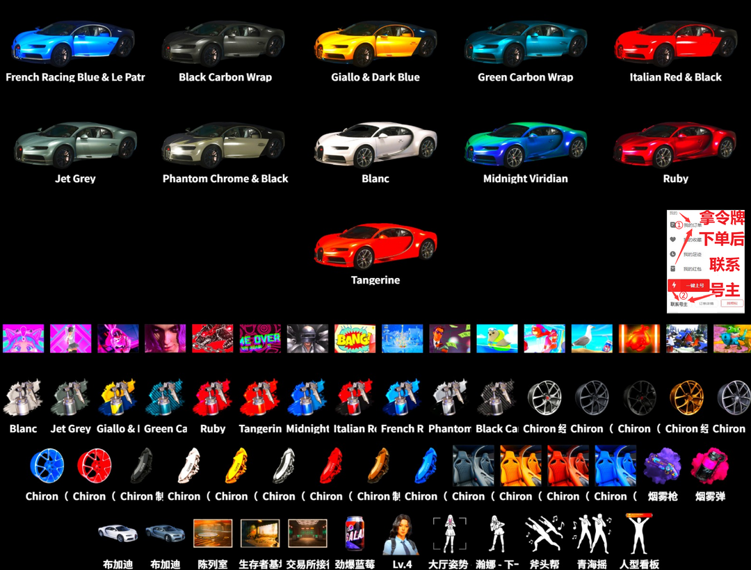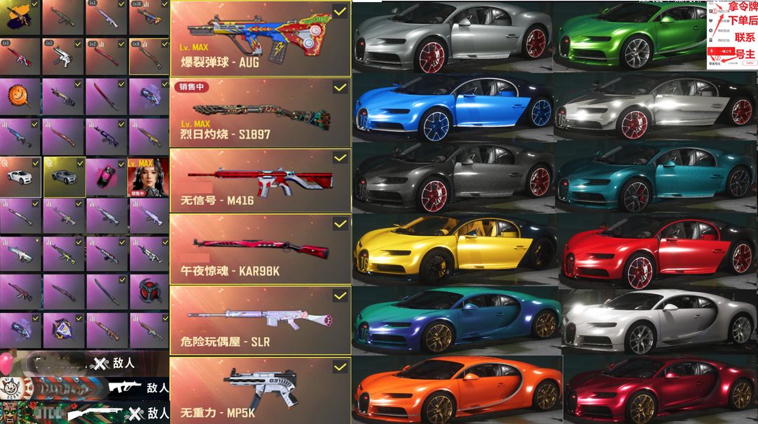 全满漆跑车布加迪威龙✅⑩AUG爆裂⑩烈日S189满级瀚娜无信号午夜98KMP5玩偶柏林战神黑人可排位