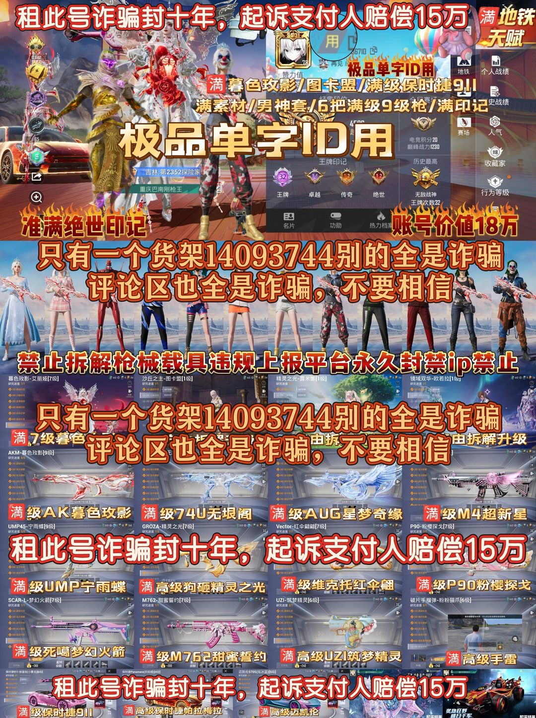 限制: 租号18次及以上 | 撤单率<60%才可租用此帐号装备描述:特别声明!!!! 分解载具枪械永久拉黑不解除 【乱投诉拉黑】和平号有问题/上不去/其他问题/ 特殊需求/投诉没用等问题 账号累计充值超30万!切勿开挂/分解装备/恶意骂人/等等违规行为,发现违规必追查到底(平台登录记录,游戏登录ip手机号 设备串号 充值付款记录不要侥幸现在网警都能调到你的所有行为记录就算盗用他人信息也一样能查到你头上)按账号充值金额=起诉/刑事立案/追责赔偿! 非速玩【非云!本机设备畅玩不卡顿】