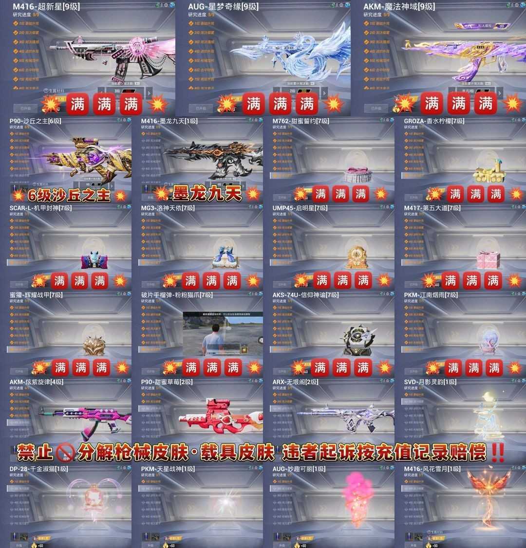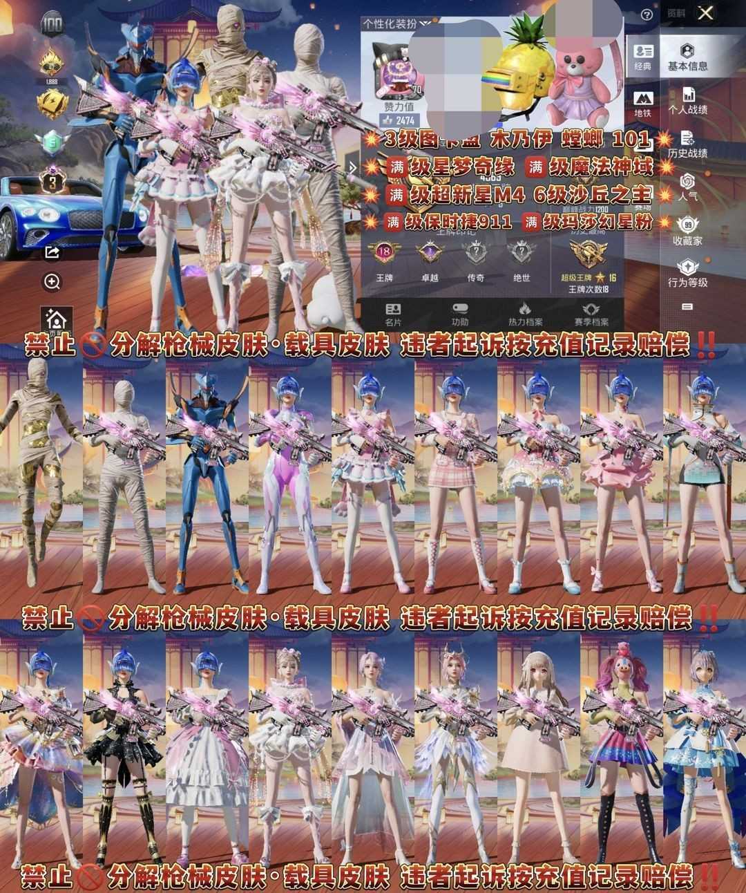 限制: 租号8次及以上 | 撤单率<60%才可租用此帐号装备描述:特别声明!!!! 分解枪械永久拉黑不解除 【乱投诉拉黑】有问题/上不去/其他问题/ 特殊需求/投诉没用等问题 账号累计充值超15万!切勿开挂/分解装备/恶意骂人/等等违规行为,发现违规必追查到底(平台登录记录,游戏登录ip手机号 设备串号 充值付款记录不要侥幸现在网警都能调到你的所有行为记录就算盗用他人信息也一样能查到你头上)按账号充值金额=起诉/刑事立案/追责赔偿! 非速玩【非云!本机设备畅玩不卡顿】