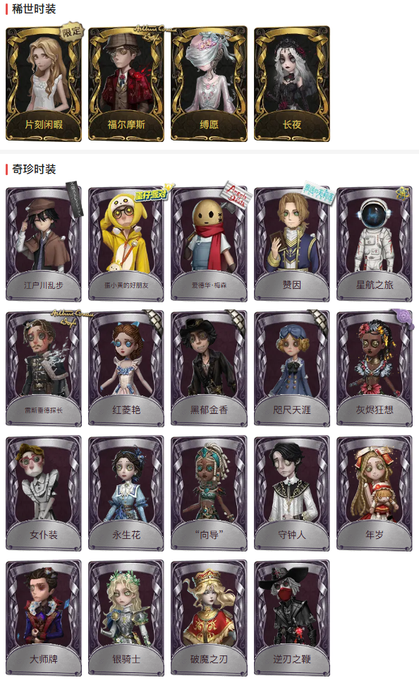 装备描述:【小号】金皮:片刻闲暇、福尔摩斯、缚愿、长夜,紫皮:江户川乱步、蛋小黄的好朋友、爱德华.梅森、赞因、星航之旅、雷斯垂德探长、红菱艳、黑郁金香、咫尺天涯、灰烬狂想、女仆装、永生花、向导、守钟人、年岁、大师牌、银骑士、破魔之刃、逆刃之鞭、