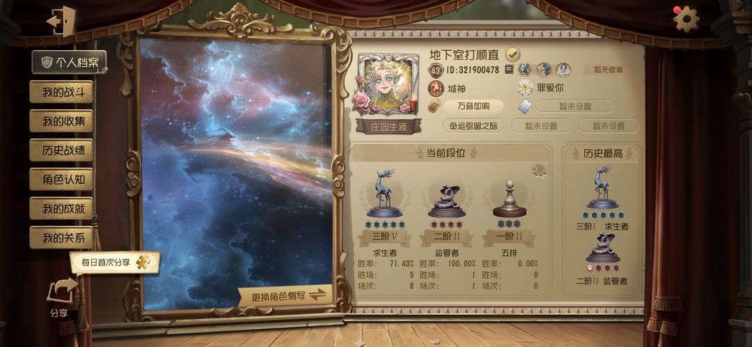装备描述:基本上求生者都有皮肤能玩,监管者我能补的也差不多都有,全角色都解锁,排位匹配随意玩,不能开挂,不能禁言,我已经把大厅聊天开了二级密码,有需要和我讲,我可以打开大厅聊天。