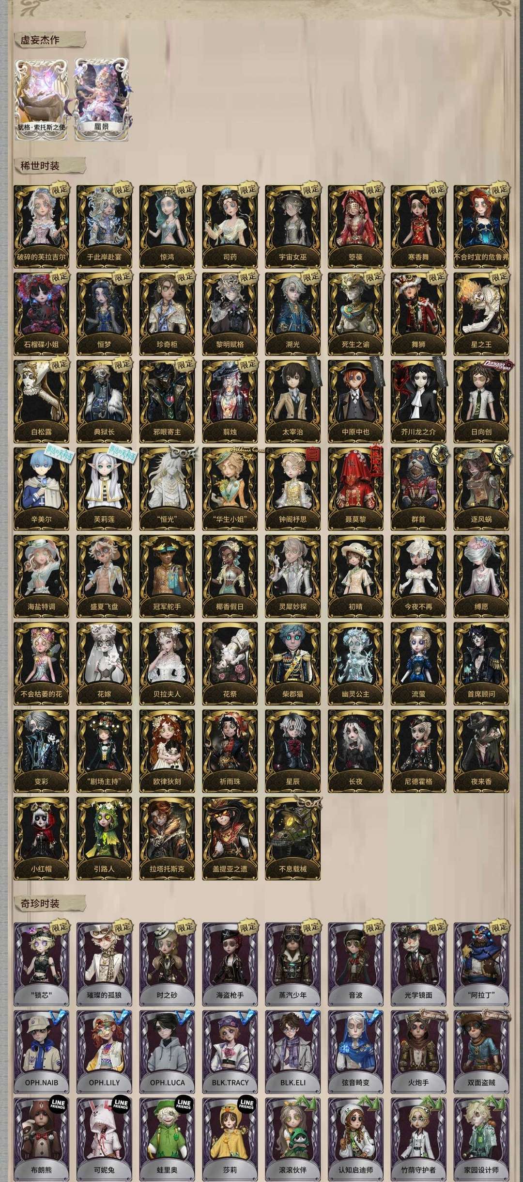 装备描述:6w氪共享2虚妄62金皮46金挂 2虚妄:小女孩-蜃景 祭司-犹格*索托斯之使 金皮:芙拉吉尔 赴宴 精华 司药 宇宙女巫 箜篌 寒香舞 危鲁弗 石榴碟 恒梦 溯光 珍奇柜 黎明赋格 舞狮 星之王 白松露 典狱长 邪眼寄主 文豪太中芥 日向创 辛美尔 芙莉莲 恒光 华生小姐 钟阁杼思 聂莫黎 紫皮:孤狼 锁芯 oph佣兵拉拉囚徒机械先知 推理之径:等风来 爱神之吻 浴石商人 梵音之舞 猩红新娘 壁画修复员 园丁公益皮 勘探公路骑士 舞女金 火炮手 双面盗贼