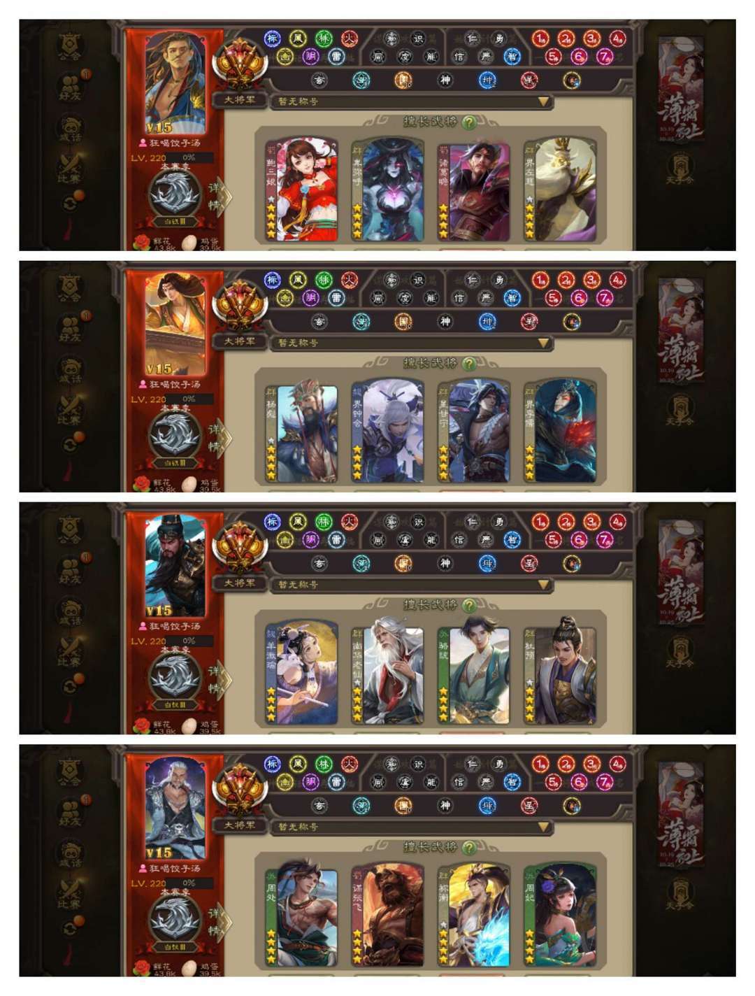 限制: 撤单率<19%才可租用此帐号装备描述:官方一等大将军,无卡,VIP15! 5五星炎龙:动刘焉动神曹操动神甘宁,金界徐盛,神郭嘉! 30四星玉龙:冠绝天下动神吕布,动神陆逊动神赵云动留赞动界孙权,动鲍三娘动王元姬动界钟会动许攸,动徐荣动界李儒动界左慈动祢衡,动羊徽瑜动卑弥呼动关索动谋张飞动星甘宁,金杨彪金马钧金诸葛瞻,曹髦杜预骆统南华老仙周处! 70史诗武将,动庞德公,金张让金司马徽,势魏延曹婴张星彩等! 70动皮125金皮185国战皮肤!