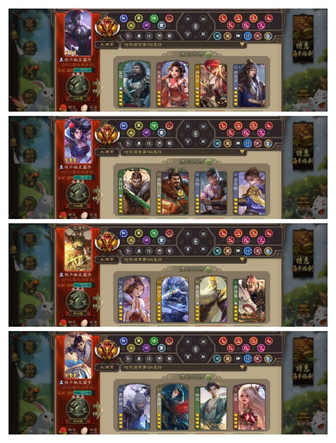 限制: 撤单率<19%才可租用此帐号装备描述:官方二等大将军,有卡,VIP11! 17四星玉龙:动神甘宁动界左慈动王元姬动界钟会,动花鬘动界李儒动留赞动张星彩动曹纯,金界徐盛金马钧金许攸金司马昭,神孙策戏志才骆统! 55史诗武将,动谋马超,南华老仙周群周处神赵云神太史慈等! 47动皮111金皮175国战皮肤!