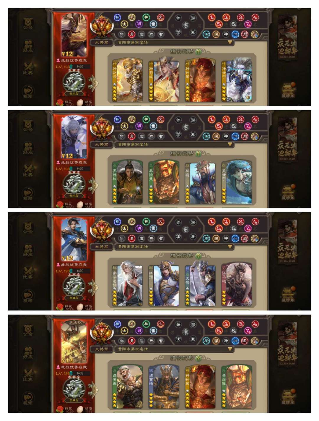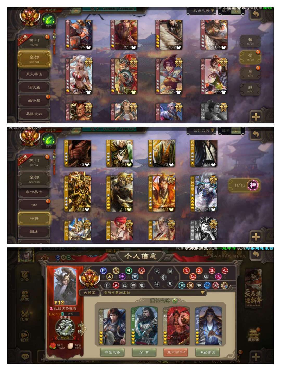 限制: 撤单率<19%才可租用此帐号装备描述:官方二等大将军,有卡,VIP12! 18四星玉龙:回廊动神孙策,回廊动聚义,回廊动界徐盛,动谋黄盖动谋曹操动神赵云动戏志才,动留赞动界孙权动谋马超动星甘宁,金杨彪,神荀彧神甘宁文鸯杜预南华老仙! 56史诗武将,冠绝天下动神吕布,回廊动界黄忠,动界钟会动王璨,金祢衡金星黄忠金张绣,阎象周群周处界李儒司马昭等! 44动皮131金皮200国战皮肤!