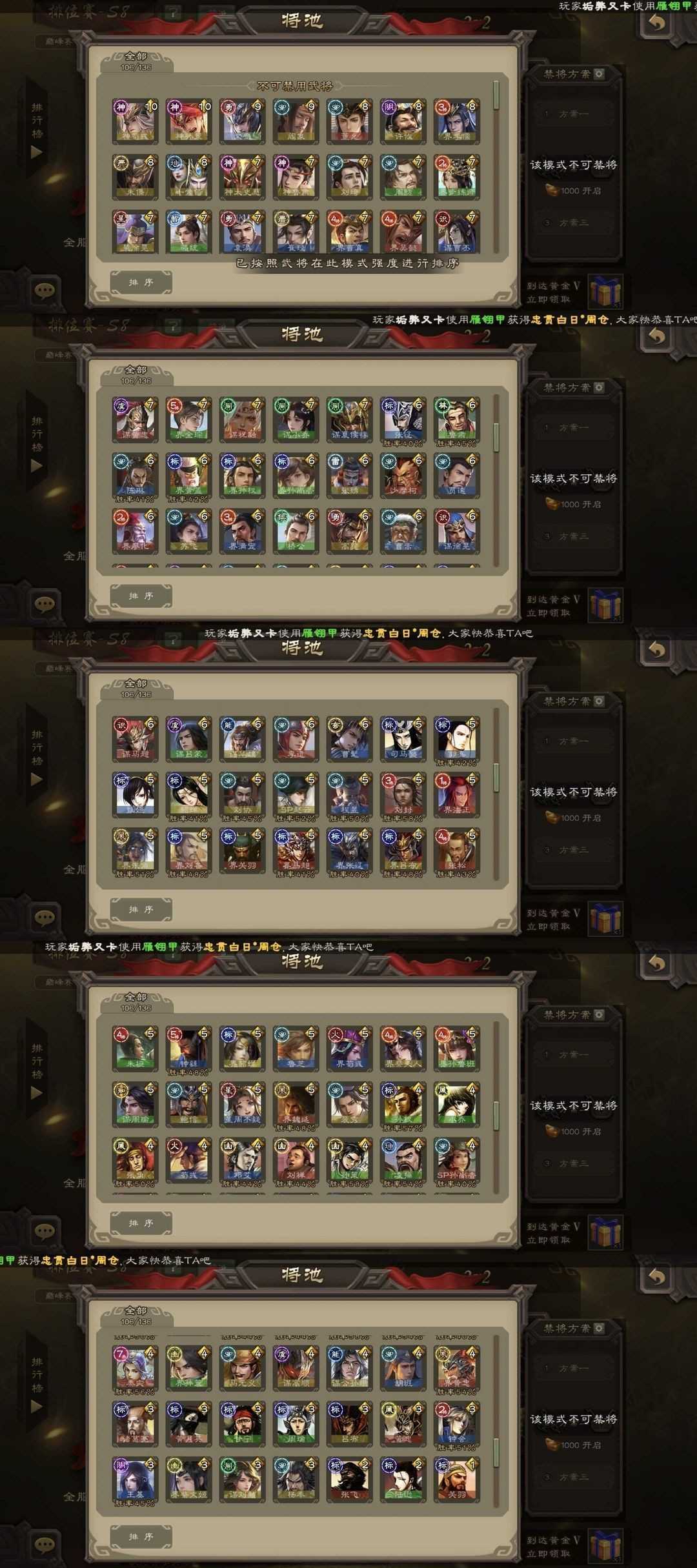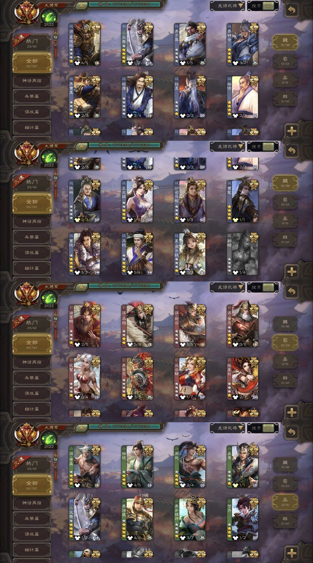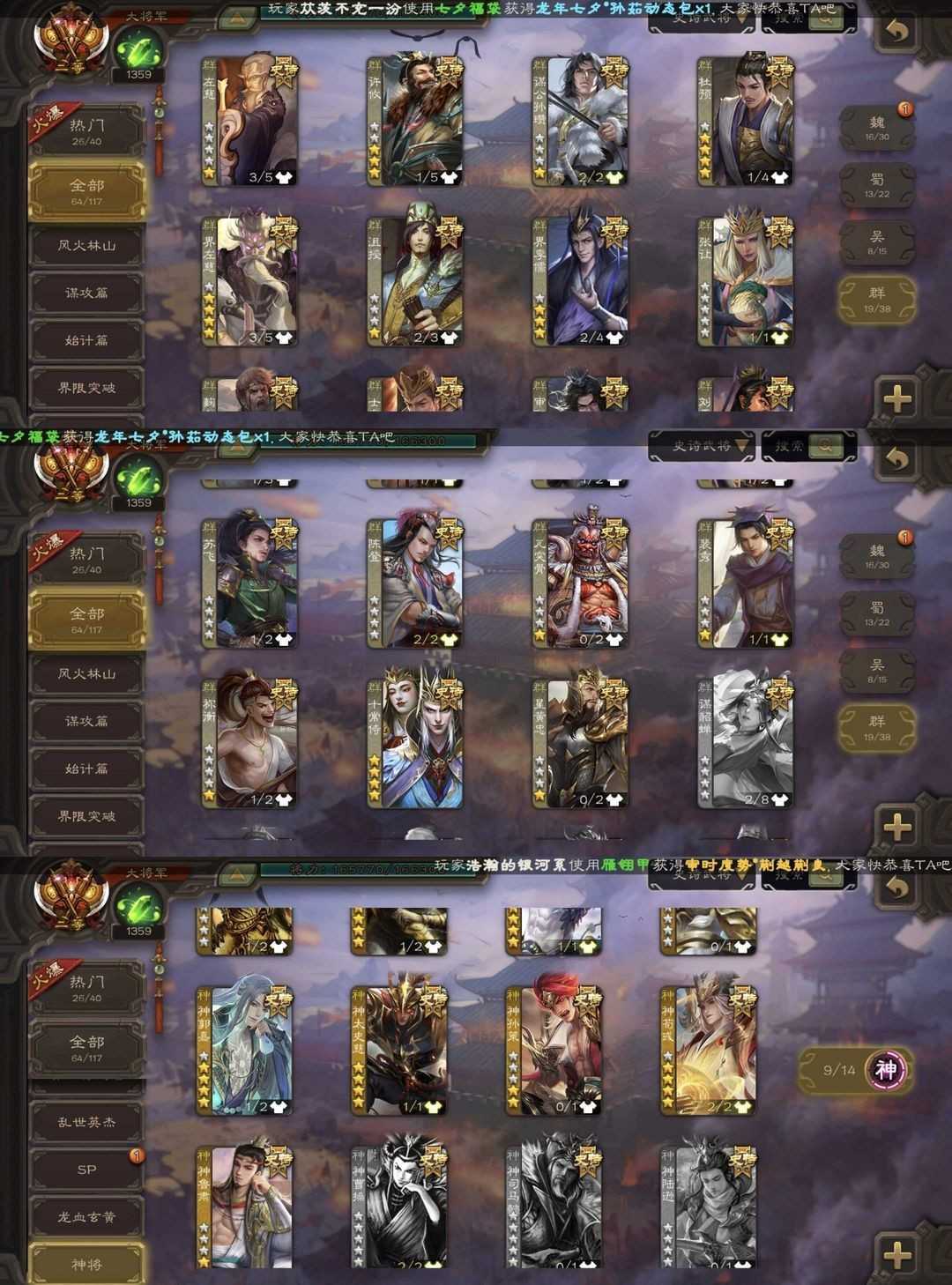 有卡(缺换将)/枭龙破渊曹髦/至尊文鸯/sp甄姬/谋公孙瓒/神鲁肃/谋夏侯淳/回廊神荀彧/刘焉
