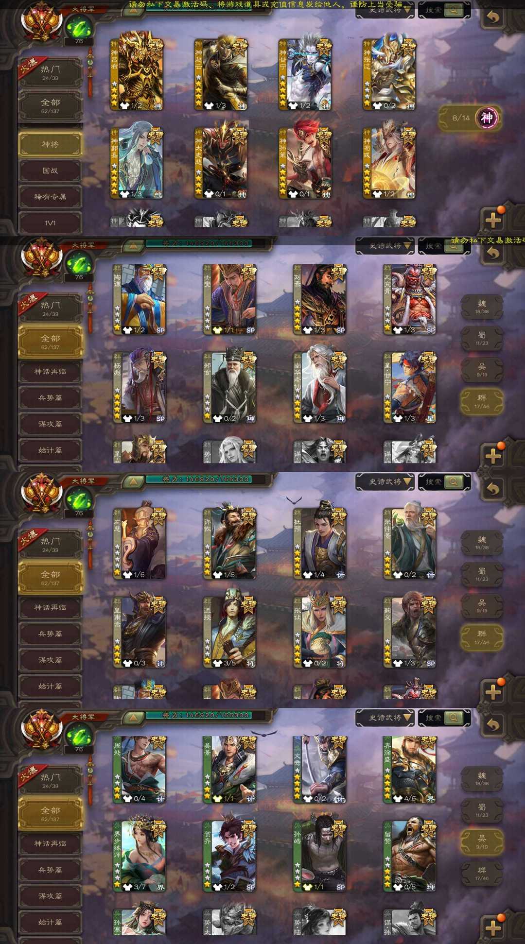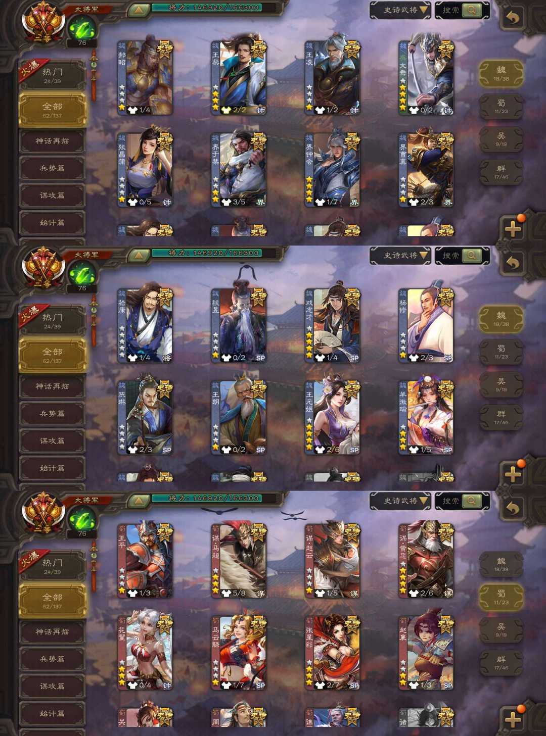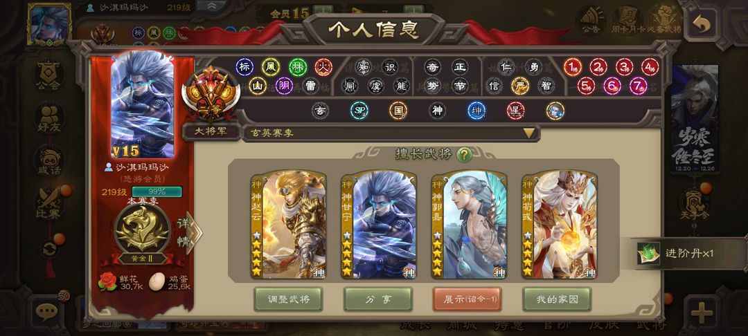 装备描述:二等大将军 VIP15 总数418 史诗62 动态皮肤44 魏国⚡郝昭⚡王粲⚡王凌⚡文鸯⚡张昌蒲⚡界于禁⚡界钟会⚡界曹真⚡嵇康⚡程昱⚡戏志才⚡杨修⚡陈琳⚡王朗⚡王元姬⚡羊徽瑜⚡曹纯⚡马钧⚡ 蜀国⚡王平⚡谋马超⚡谋赵云⚡谋黄忠⚡花鬘⚡马云騄⚡张星彩⚡赵襄⚡关索⚡周群⚡谯周⚡ 吴国⚡周处⚡吴景⚡文鸯⚡界徐盛⚡界步练师贺齐⚡孙皓⚡留赞⚡孙寒华⚡ 群雄⚡左慈⚡许攸⚡杜预⚡张仲景⚡皇甫嵩⚡沮授⚡张让⚡麴义⚡陶谦⚡士燮⚡刘焉⚡兀突骨⚡杨彪⚡郑玄⚡南华老仙⚡星甘宁⚡星黄忠⚡ 神将⚡神吕布⚡神赵云⚡神甘宁⚡神张辽⚡神郭嘉⚡神太史慈⚡神孙策⚡神荀彧⚡ 排位123 国战40⚡ 鼠年冬至-王元姬 破军杀将-徐盛 雄踞益州-刘焉 野鹤闲云-南华老仙 战龙在野-神赵云 冠绝天下-神吕布 万人辟易-神甘宁