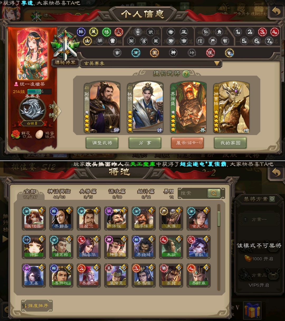 【锦鲤】111排位/动态刘焉/动态神曹操/神鲁肃/至臻杜预/大宝