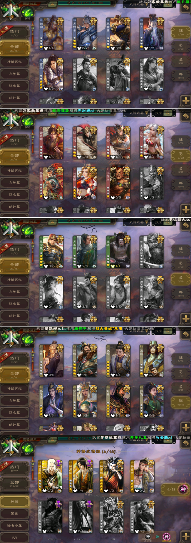 装备描述:◆◆魏◆◆界钟会、曹纯、程昱、郝昭、界曹真 ◆◆蜀◆◆花鬟、谋马超、沙摩柯、谋赵云、诸葛瞻、界黄忠、马云禄 ◆◆吴◆◆界徐盛、界朱然、孙皓 ◆◆群◆◆刘焉、杜预、许攸、界李儒、星黄忠、张让、左慈、沮授、兀突骨、苏飞 ◆◆神◆◆神鲁肃、神曹操