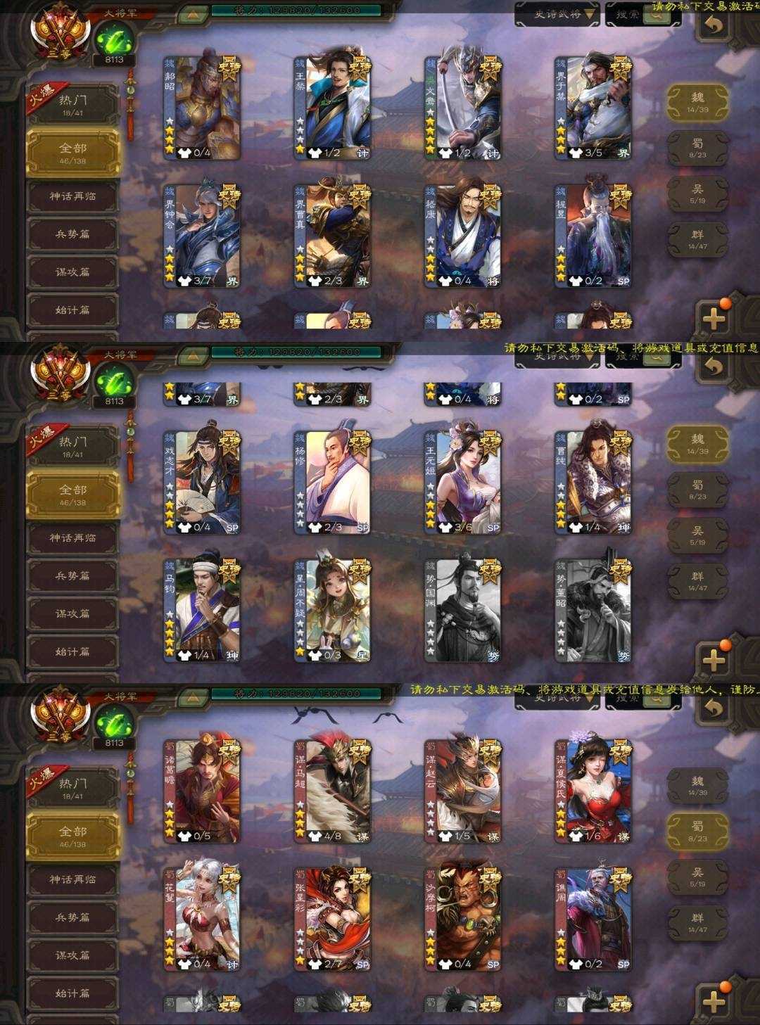 装备描述:三等大将军 VIP10 武将总数374 史诗武将46 动态皮肤37 魏国武将⚡郝昭⚡王粲⚡文鸯⚡界于禁⚡界钟会⚡界曹真⚡嵇康⚡程昱⚡戏志才⚡杨修⚡王元姬⚡曹纯⚡马钧⚡星周不疑⚡ 蜀国武将⚡诸葛瞻⚡谋马超⚡谋赵云⚡谋夏侯氏⚡花鬘⚡张星彩⚡沙摩柯⚡谯周⚡ 吴国武将⚡骆统⚡周处⚡界徐盛⚡留赞⚡ 群雄武将⚡左慈⚡许攸⚡杜预⚡界左慈⚡沮授⚡界李儒⚡张让⚡麹义⚡士燮⚡王允⚡兀突骨⚡南华老仙⚡星黄忠⚡友诸葛亮⚡ 神将⚡神吕布⚡神赵云⚡神陆逊⚡神刘备⚡神甘宁⚡神张辽⚡ 排位武将105 国战武将94
