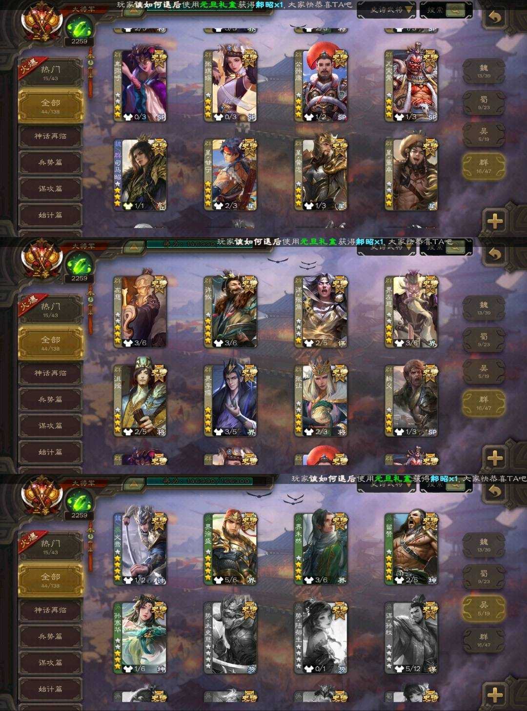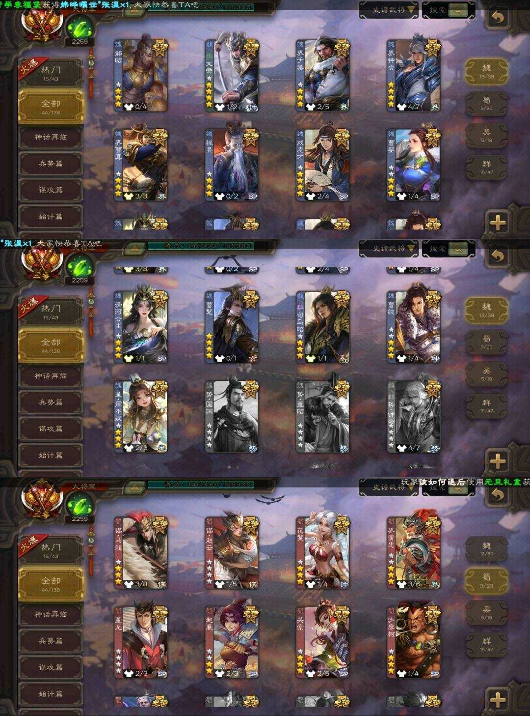装备描述:魏国武将⚡郝昭⚡文鸯⚡界于禁⚡界钟会⚡界曹真⚡程昱⚡戏志才⚡曹婴⚡清河公主⚡曹髦⚡司马昭⚡曹处⚡星周不疑⚡ 蜀国武将⚡谋马超⚡谋赵云⚡花鬘⚡界黄忠⚡董允⚡赵襄⚡关索⚡沙摩柯⚡谯周⚡ 吴国武将⚡界徐盛⚡界朱然⚡留赞⚡孙寒华⚡ 群雄武将⚡左慈⚡许攸⚡谋张角⚡界左慈⚡沮授⚡界李儒⚡张让⚡麹义⚡卑弥呼⚡张琪瑛⚡公孙康⚡兀突骨⚡司马昭⚡星甘宁⚡星黄忠⚡星董卓⚡⚡ 神将⚡神吕布⚡神赵云⚡神张辽⚡ 排位武将123 国战武将98