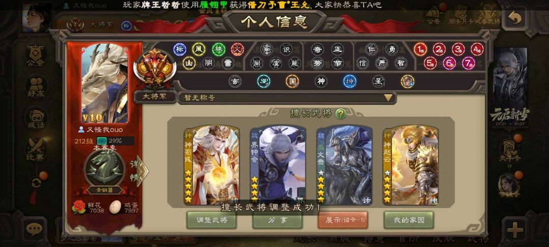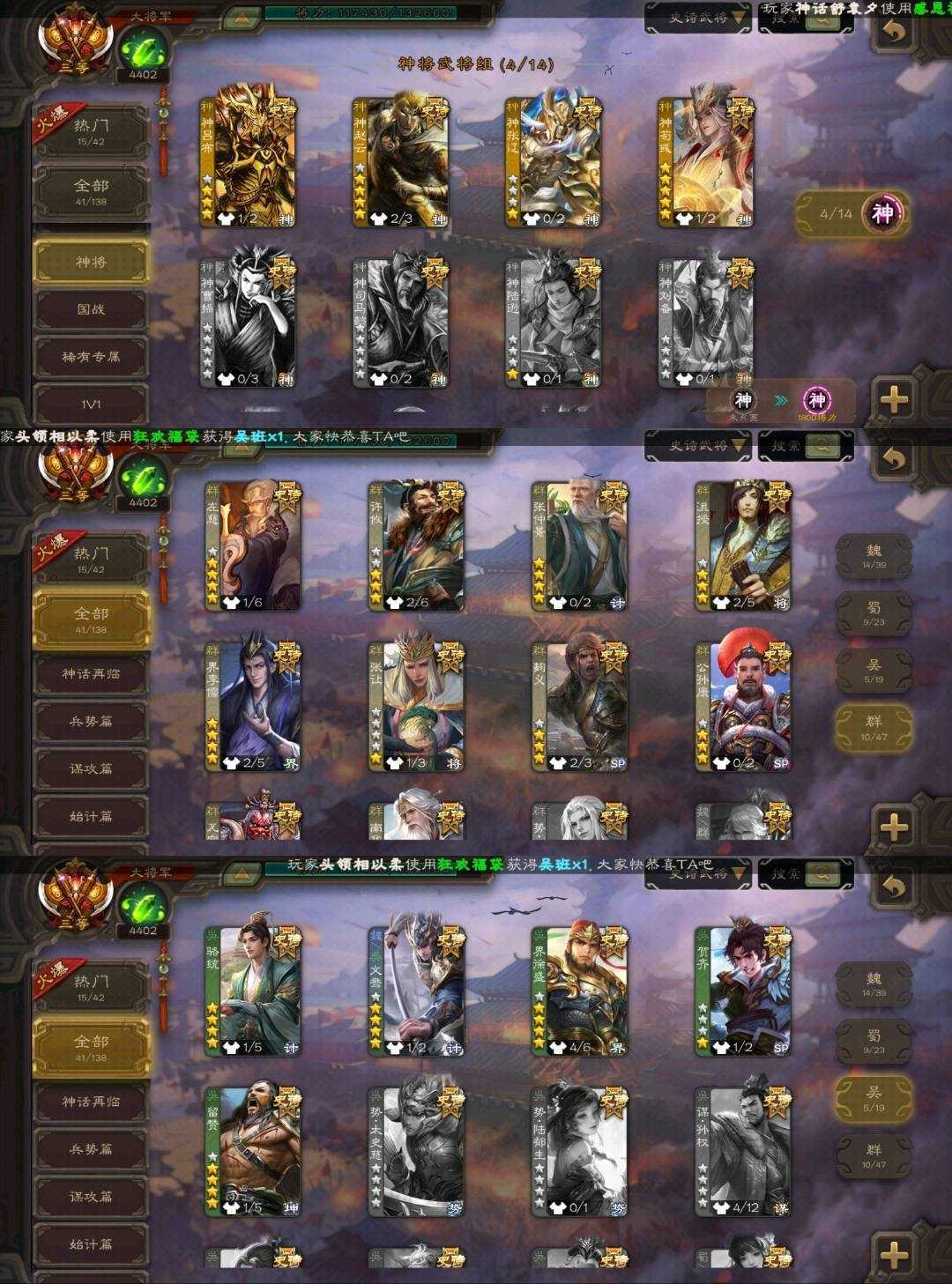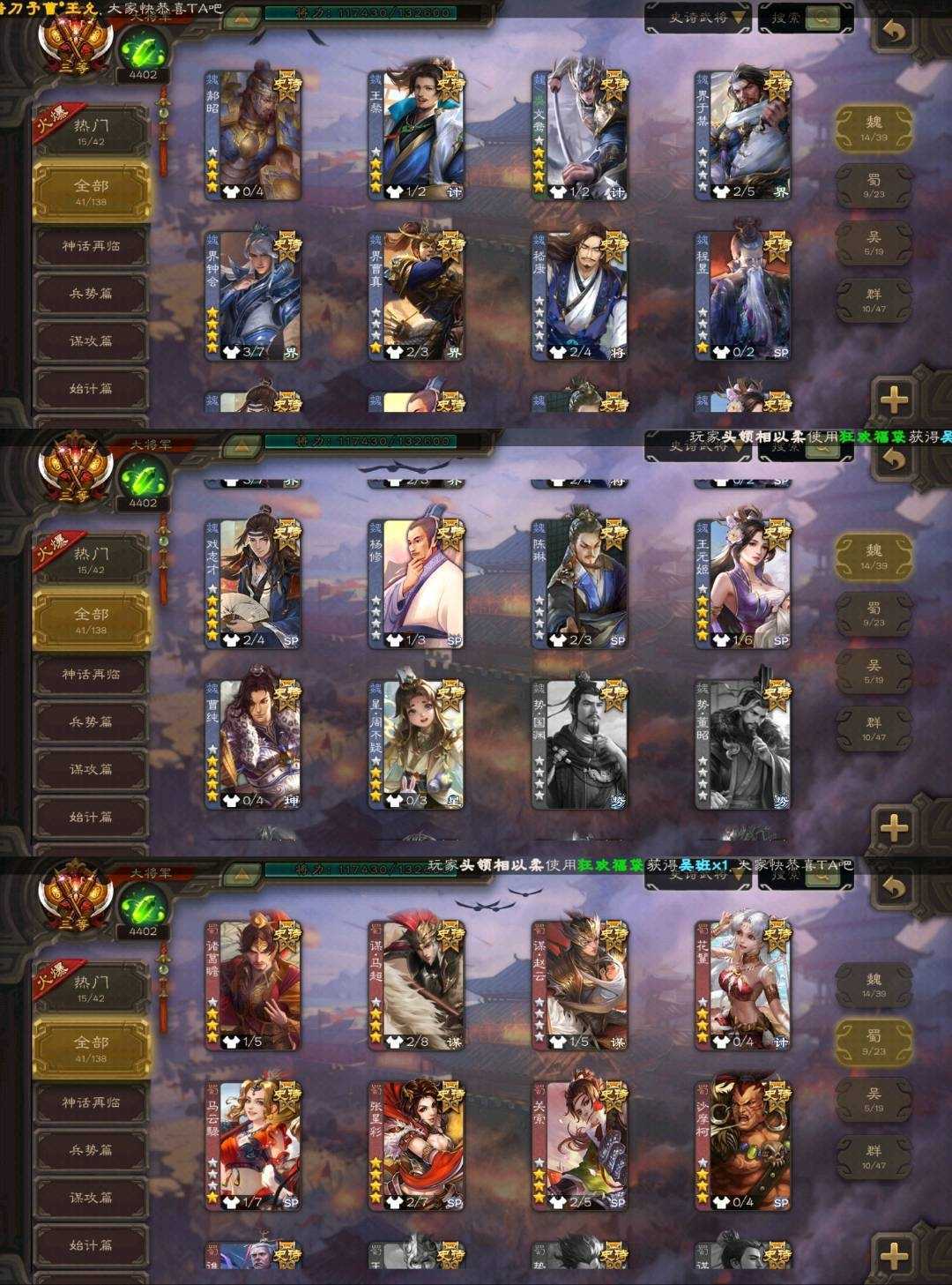 装备描述:魏国武将⚡郝昭⚡王粲⚡文鸯⚡界于禁⚡界钟会⚡界曹真⚡嵇康⚡程昱⚡戏志才⚡杨修⚡陈琳⚡王元姬⚡曹纯⚡星周不疑⚡ 蜀国武将⚡诸葛瞻⚡谋马超⚡谋赵云⚡花鬘⚡马云騄⚡张星彩⚡关索⚡沙摩柯⚡谯周⚡ 吴国武将⚡骆统⚡界徐盛⚡贺齐⚡留赞⚡ 群雄武将⚡左慈⚡许攸⚡张仲景⚡沮授⚡界李儒⚡张让⚡麹义⚡公孙康⚡兀突骨⚡南华老仙⚡ 神将⚡神吕蒙⚡神周瑜⚡神吕布⚡神赵云⚡神张辽⚡神荀彧⚡ 排位武将114 国战武将92 冠绝天下-神吕布 战龙在野-神赵云 势若万钧-文鸯 鼠年冬至-王元姬 临军对阵-张星彩 破军杀将-徐盛 灵魂歌王-留赞 鸠杀少帝-李儒 扬刀立威-麹义
