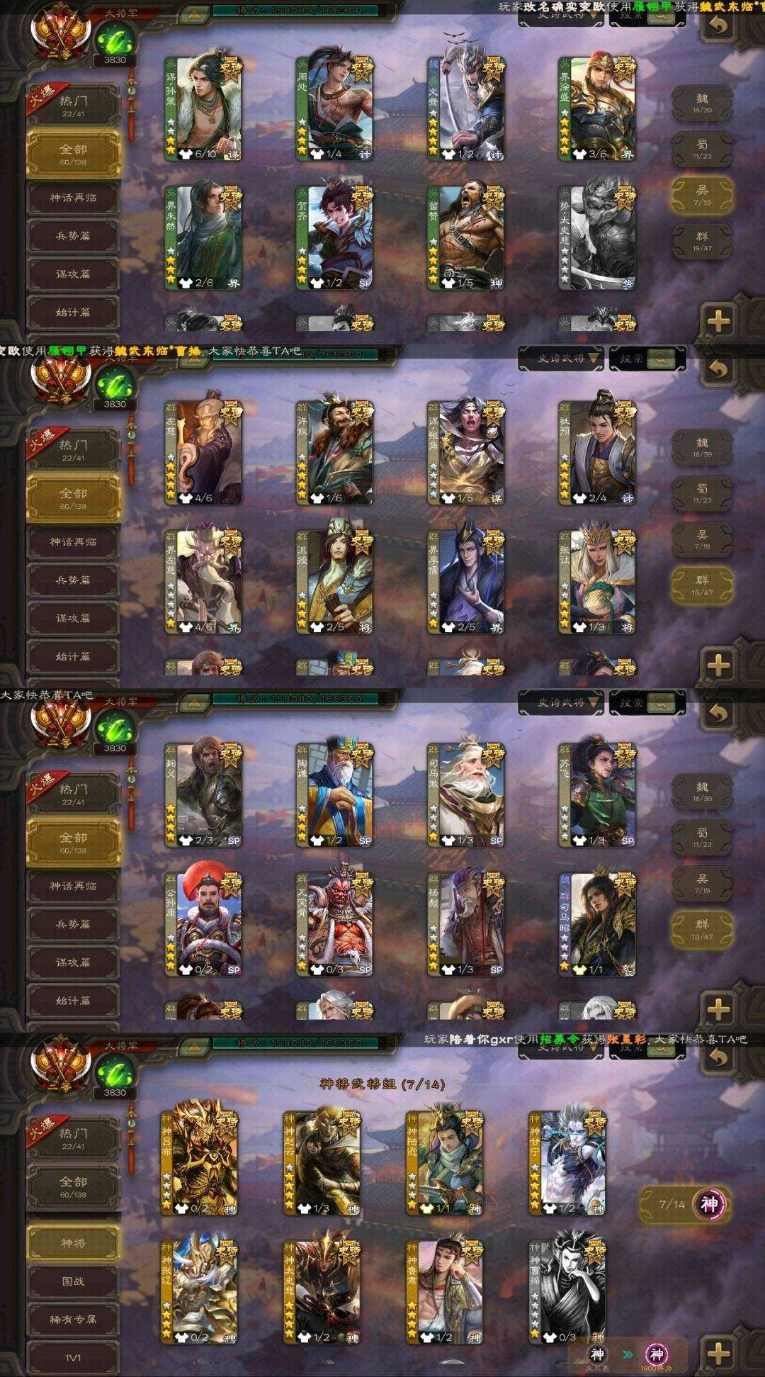 装备描述:魏国武将⚡郝昭⚡王粲⚡文鸯⚡界于禁⚡界钟会⚡界曹真⚡嵇康⚡程昱⚡戏志才⚡杨修⚡陈琳⚡曹婴⚡王元姬⚡SP司马昭⚡司马昭⚡曹纯⚡马钧⚡司马师⚡ 蜀国武将⚡诸葛瞻⚡⚡谋诸葛亮⚡谋马超⚡谋赵云⚡花鬘⚡界黄忠⚡马云禄⚡董允⚡关索⚡沙摩柯⚡谯周⚡ 吴国武将⚡谋孙策⚡⚡周处⚡界徐盛⚡界朱然⚡贺齐⚡留赞⚡ 群雄武将⚡左慈⚡许攸⚡谋张角⚡杜预⚡界左慈⚡沮授⚡界李儒⚡张让⚡麹义⚡陶谦⚡司马徽⚡苏飞⚡公孙康⚡兀突骨⚡杨彪⚡司马昭⚡祢衡⚡南华老仙⚡星董卓⚡ 神将⚡神吕布⚡神赵云⚡神陆逊⚡神甘宁⚡神张辽⚡神太史慈⚡神鲁肃⚡ 排位武将121 国战武将98