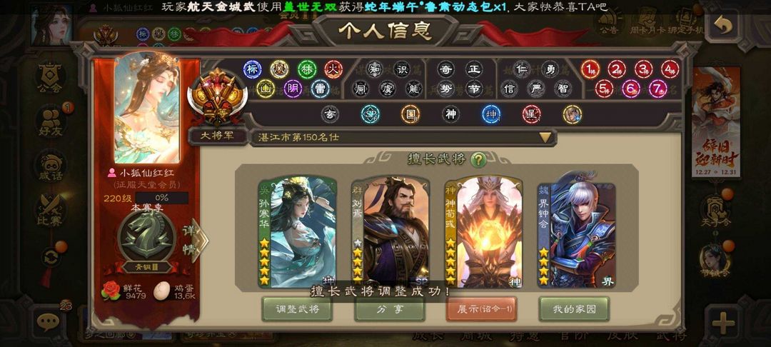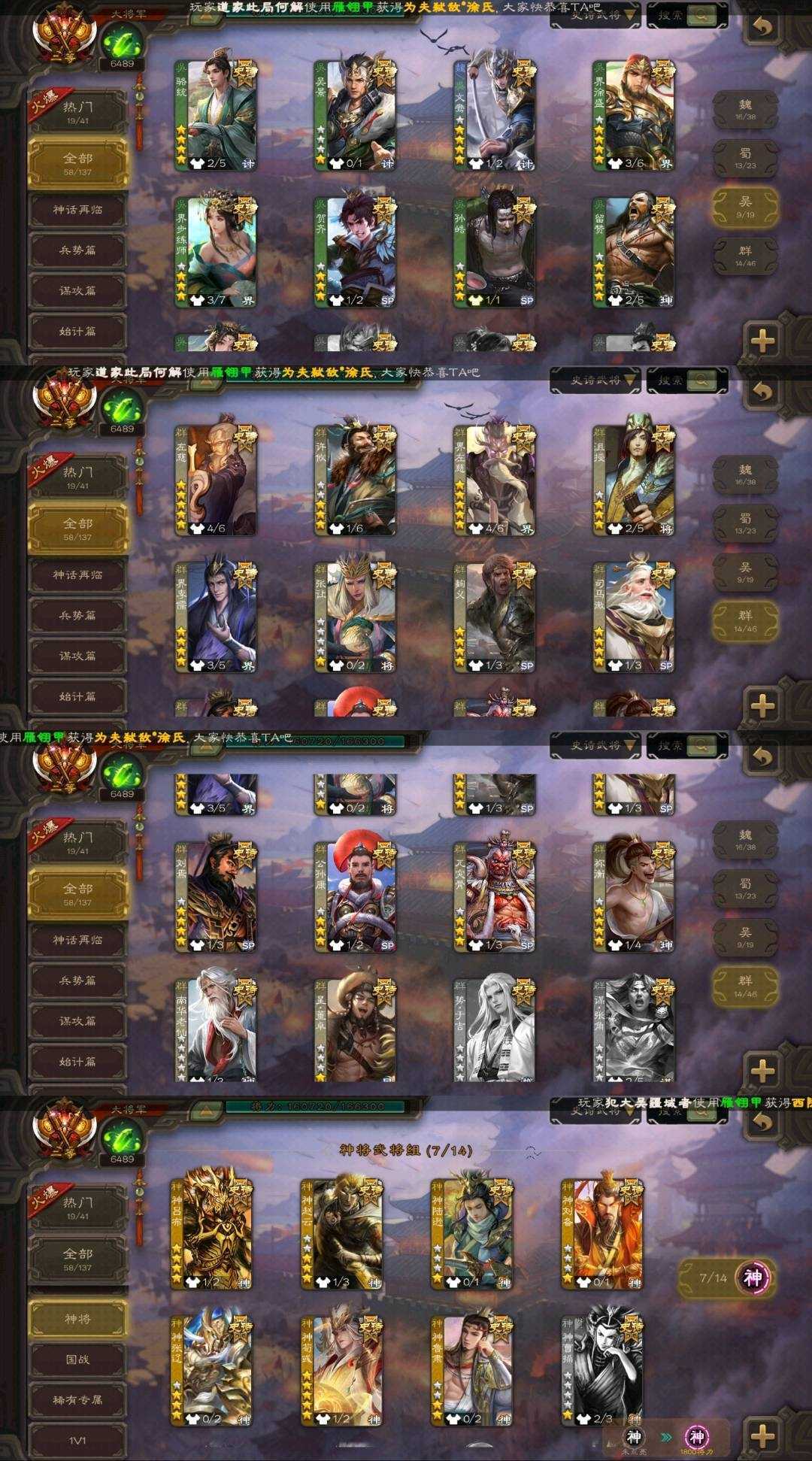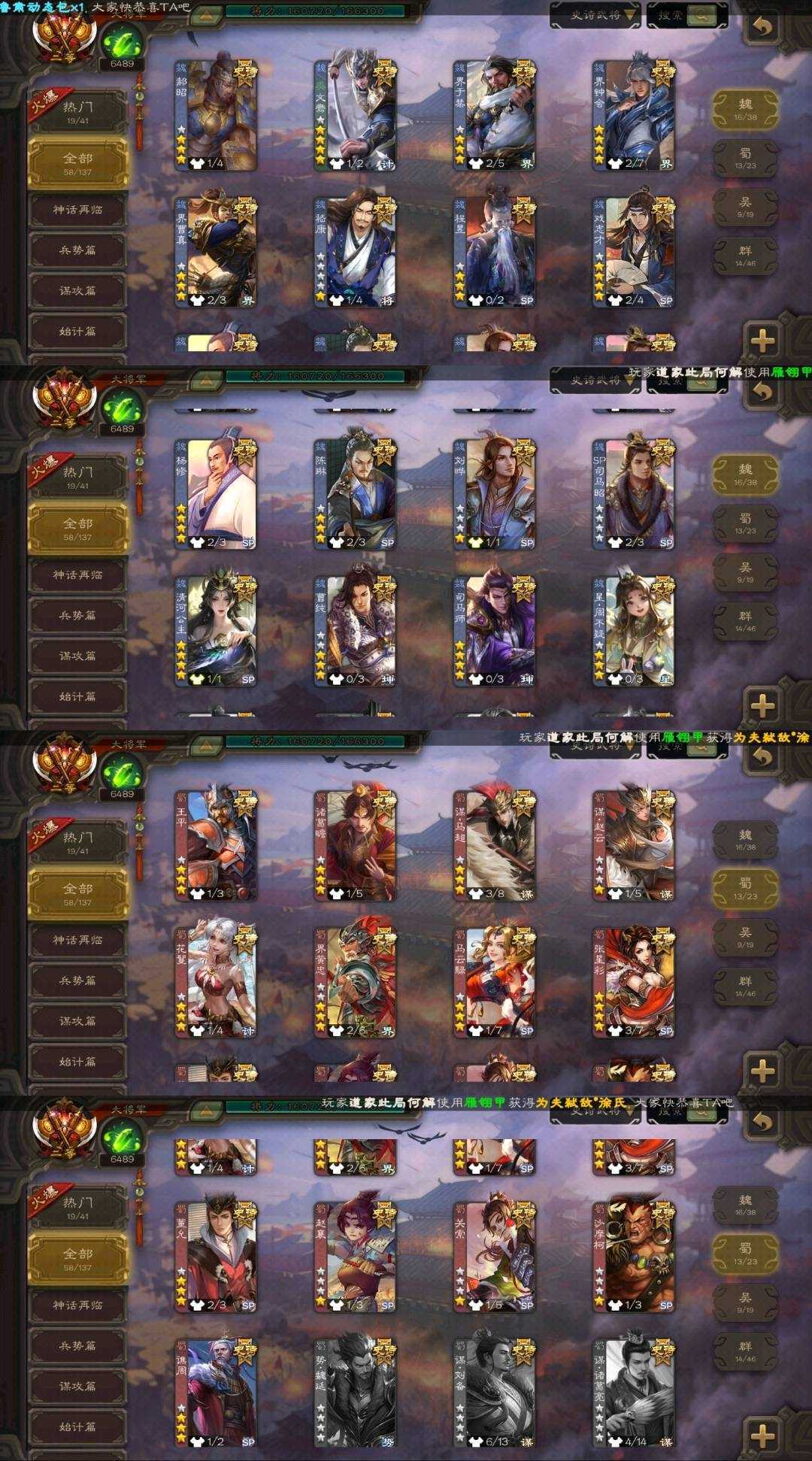装备描述:魏国:⚡郝昭⚡文鸯⚡界于禁⚡界钟会⚡界曹真⚡嵇康⚡程昱⚡戏志才⚡杨修⚡陈琳⚡刘晔⚡SP司马昭⚡清河公主⚡曹纯⚡司马师⚡星周不疑⚡ 蜀国:⚡王平⚡诸葛瞻⚡谋马超⚡谋赵云⚡花鬘⚡界黄忠⚡马云禄⚡张星彩⚡董允⚡赵襄⚡关索⚡沙摩柯⚡谯周⚡ 吴国:⚡骆统⚡吴景⚡界徐盛⚡界步练师⚡贺齐⚡孙皓⚡留赞⚡孙寒华⚡ 群雄:⚡左慈⚡许攸⚡界左慈⚡沮授⚡界李儒⚡张让⚡麴义⚡司马徽⚡刘焉⚡公孙康⚡兀突骨⚡祢衡⚡南华老仙⚡星董卓⚡ 神将:⚡神关羽⚡神吕蒙⚡神周瑜⚡神诸葛亮⚡神吕布⚡神赵云⚡神陆逊⚡神刘备⚡神张辽⚡神荀彧⚡神鲁肃⚡ 排位:116 国战:96 冠绝天下-神吕布 鳞振九霄-神赵云 匡汉延祚-神荀彧 举棋若定-戏志才 临军对阵-张星彩 灵魂歌王-留赞 蛇年限定-孙寒华 威灵尽显-孙寒华 鸠杀少帝-李儒 雄踞益州-刘焉