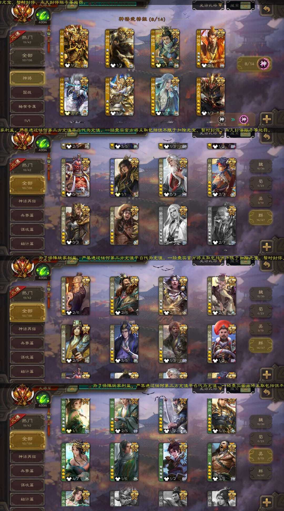 装备描述:魏国武将⚡文鸯⚡界于禁⚡界钟会⚡界曹真⚡嵇康⚡程昱⚡戏志才⚡曹婴⚡清河公主⚡曹髦⚡司马昭⚡曹纯马钧⚡星周不疑⚡ 蜀国武将⚡谋马超⚡谋赵云⚡花鬘⚡董允⚡沙摩柯⚡谯周⚡ 吴国武将⚡势陆郁生⚡骆统⚡文鸯⚡界徐盛⚡界步练师⚡界朱然⚡贺齐⚡留赞⚡孙寒华⚡ 群雄武将⚡左慈⚡许攸⚡谋张角⚡界左慈⚡沮授⚡界李儒⚡麴义⚡公孙康⚡兀突骨⚡司马昭⚡南华老仙⚡星甘宁星黄忠⚡星董卓⚡ 神将⚡神吕布⚡神赵云⚡神陆逊⚡神刘备⚡神甘宁⚡神张辽⚡神郭嘉⚡神太史慈⚡ 排位武将133 国战武将39 势若万钧-文鸯 潜蛟觊天-钟会 举棋若定-戏志才 破军杀将-徐盛 灵魂歌王-留赞 威灵尽显-孙寒华 蛇年限定-孙寒华 鸠杀少帝-李儒 冠绝天下-神吕布 战龙在野-神赵云 倚星折月-神郭嘉 万人辟易-神甘宁 绽焰摧枯-神陆逊 勇撼日月-神太史慈 战破-神甘宁