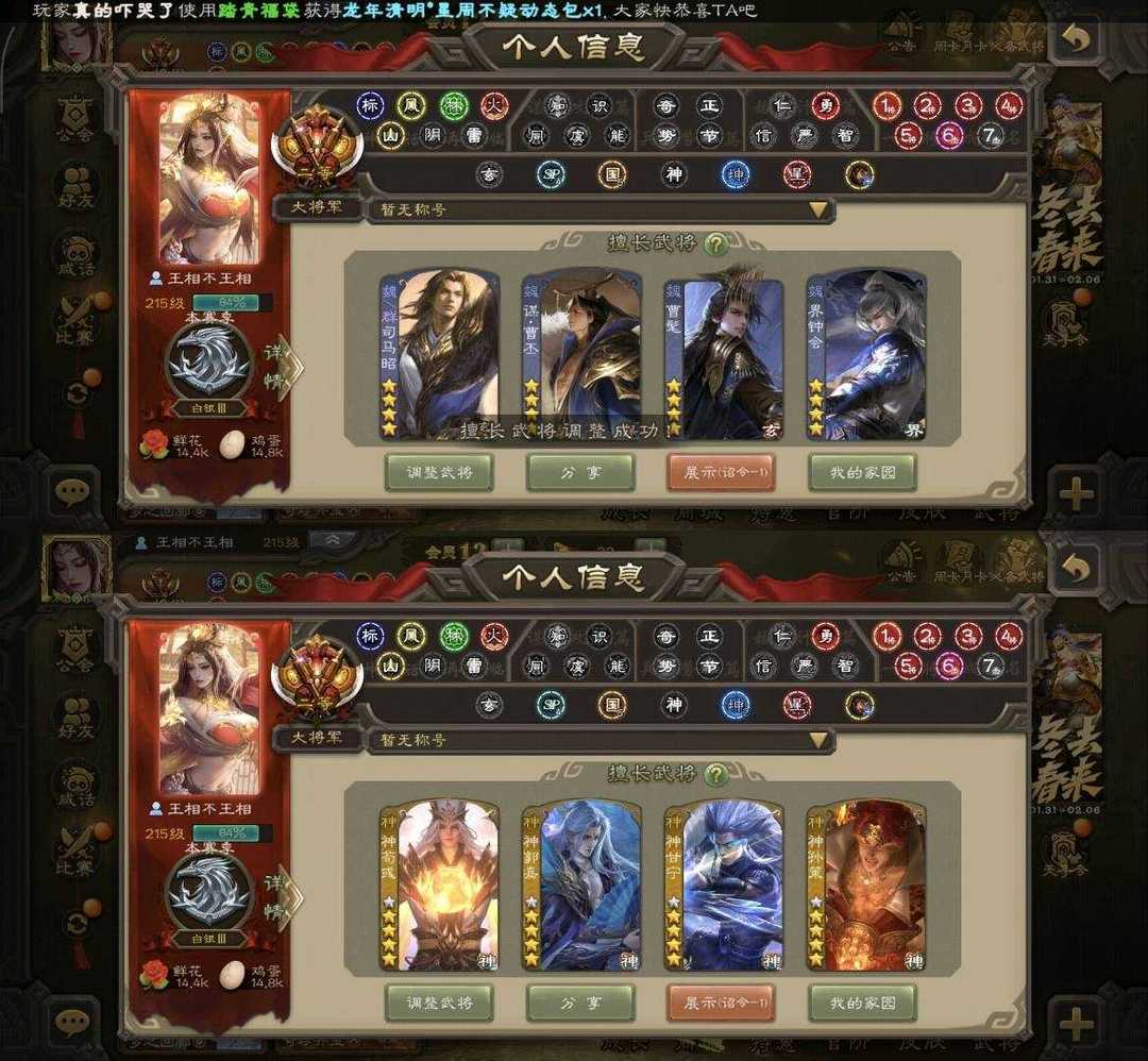 装备描述:二等大将军 VIP:12 武将总数:417 史诗武将:65 动态皮肤:56 魏国武将:⚡谋曹丕⚡王粲⚡文鸯⚡界于禁⚡界钟会⚡界曹真⚡嵇康⚡程昱⚡戏志才⚡程昱⚡陈琳⚡刘晔⚡王元姬⚡清河公主⚡曹髦⚡司马昭⚡曹纯⚡马钧⚡星周不疑⚡ 蜀国武将:⚡诸葛瞻⚡势魏延⚡谋诸葛亮⚡谋马超⚡谋赵云⚡谋黄忠⚡花鬘⚡界黄忠⚡马云騄⚡赵襄⚡关索⚡沙摩柯⚡傅佥⚡ 吴国武将:⚡势太史慈⚡势陆郁生⚡谋黄盖⚡骆统⚡文鸯⚡界徐盛⚡贺齐⚡留赞⚡ 群雄武将:⚡左慈⚡许攸⚡谋貂蝉⚡界左慈⚡沮授⚡界沮授⚡张让⚡麴义⚡司马徽⚡卑弥呼⚡刘焉⚡公孙康⚡兀突骨⚡司马昭⚡祢衡⚡南华老仙⚡庞德公⚡星黄忠⚡星董卓⚡ 神将:⚡神吕布⚡神赵云⚡神刘备⚡神甘宁⚡神张辽⚡神郭嘉⚡神孙策⚡神荀彧⚡ 排位武将:141 国战武将:41 势若万钧-文鸯 潜蛟觊天-钟会 气荡山河-曹丕 举棋若定-戏志才 火烧博望-卧龙诸葛 破军杀将-徐盛 舞惑群心-貂蝉 冠绝天下-南华老仙 扬刀立威-麹义 雄踞益州-刘焉 落定天元-沮授 倚星折月-神郭嘉 匡汉延祚-神荀彧 万人辟易-神甘宁 霸王在世-神孙策 战龙在野-神赵云