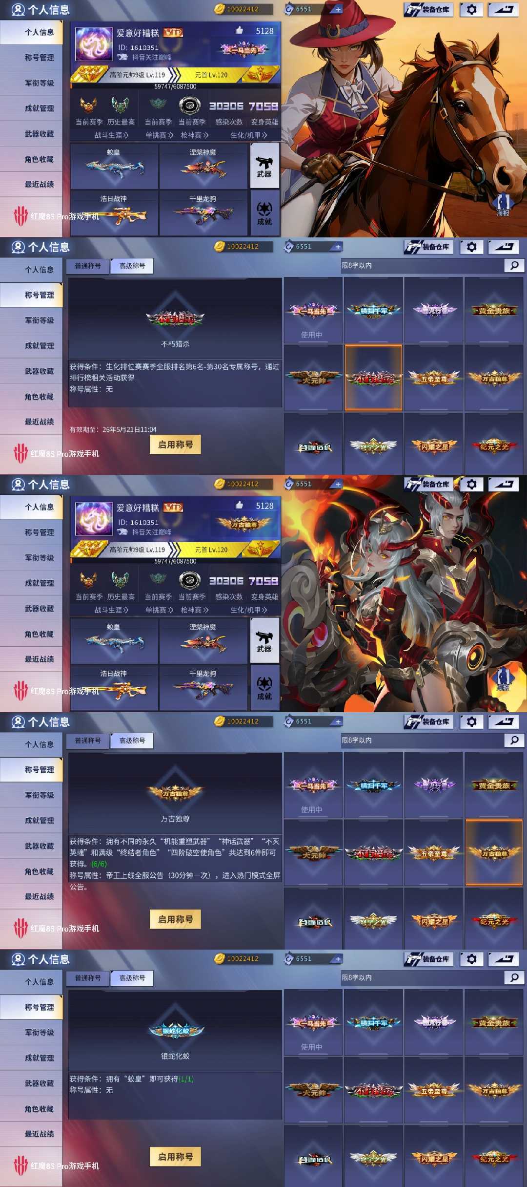 装备描述: 三区成就榜榜一 4399三区极品号 大元帅174w图鉴 盒子三区 ☔重复武器如下: ✨金甲×6 兔兔刀×3 ❤️(到时可多玩,挤号,恶意撤单 永久拉黑) ❤️道具弹匣血清限定寒假包月已开❤️ ❤️祝宝子们娱乐愉快丶到时不下❤️ (新增武器请看介绍) ☔新增全新不灭英魂千里龙驹 ☔新增全新五星绝影 ⚡新增光晕源 ⚡新增达尔文系列跃迁-星尘(已满阶) ⚡新增神话副武器涅槃神魔