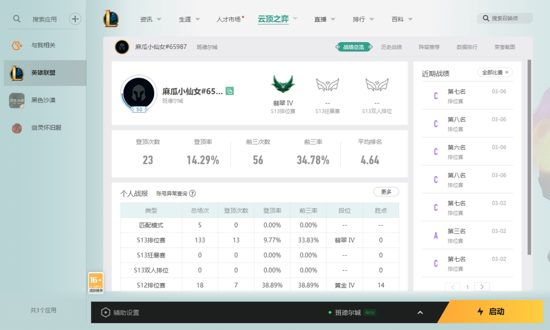 【电4班德尔城】云顶之羿【S16翡翠号】适合开黑垫分使用【钻石翡翠铂金可排】
