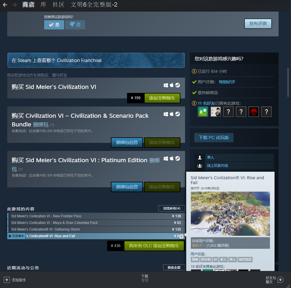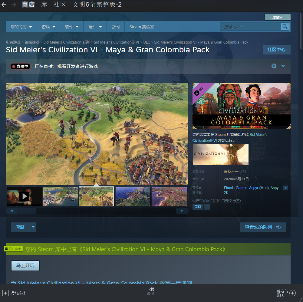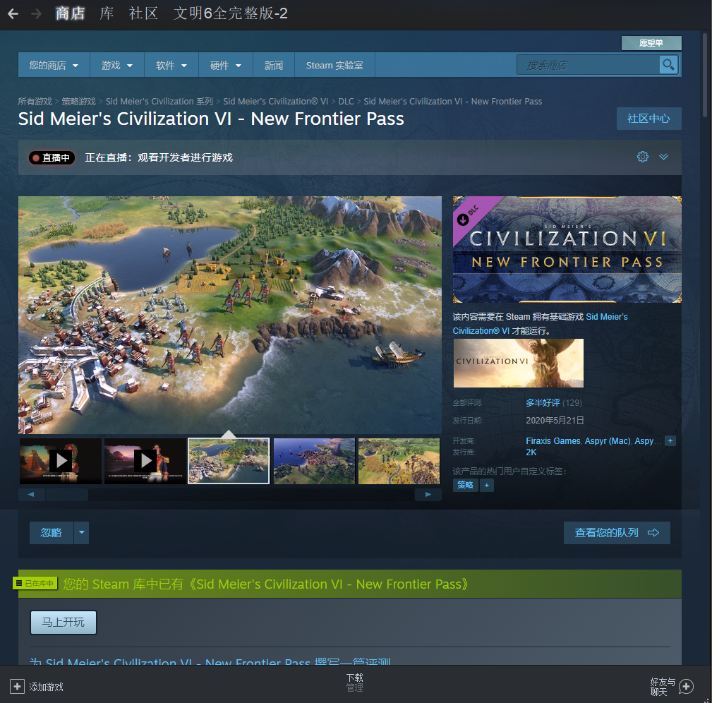 装备描述:《文明6终极版》已购买2020年5月21日发售-新纪元季票+迭起兴衰+风云变幻+6种族DLC-近千小时大号-全DLC~欢迎体验!