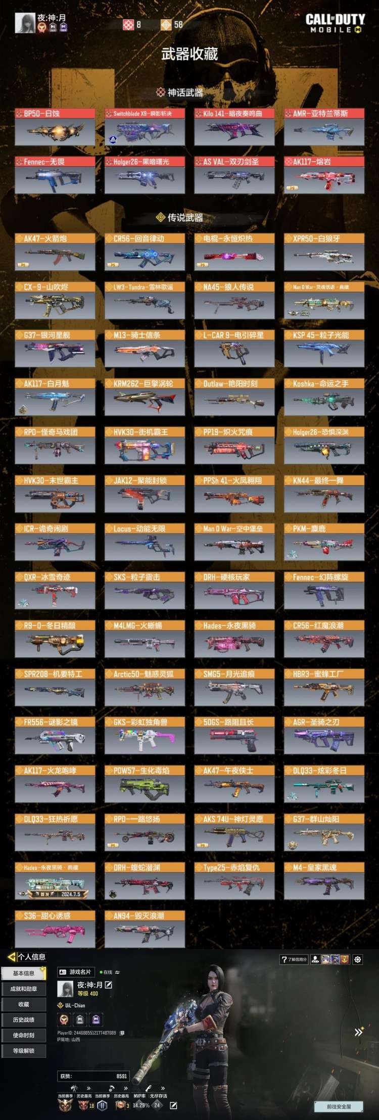 限制: 租号7次及以上 |装备描述:⭐信誉分870 肘子精品号 文明游戏,谢谢配合 ⭐雪林歌谣,动能无限,先进火力,炫彩冬日,斗转星移,海神之戟,命运之手青眸白虎,街机霸王,末世霸主,粒子光能,巨擘涡轮等 ⭐最新狼狙 LW3雪林歌谣全套更新,钻皮已肝 ⭐400多迷彩皮肤 ⭐请不要使用第三方进行游戏,登录ip显示很清楚,下单地址显示很清楚,心悦3真实数据,如出现账号违规被封停的现象,定会向分主管索取你的下单信息