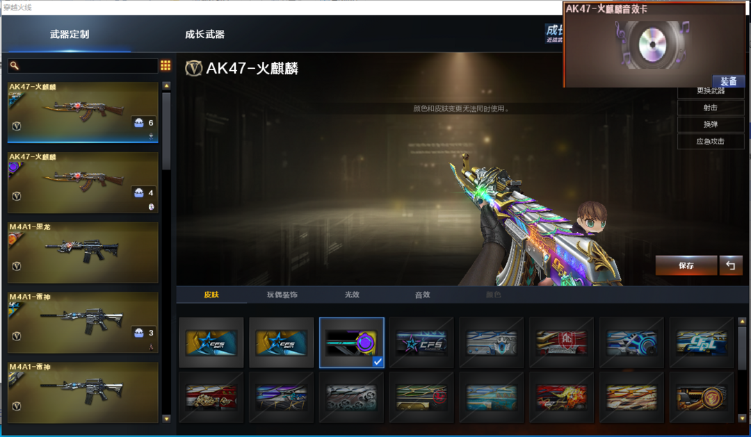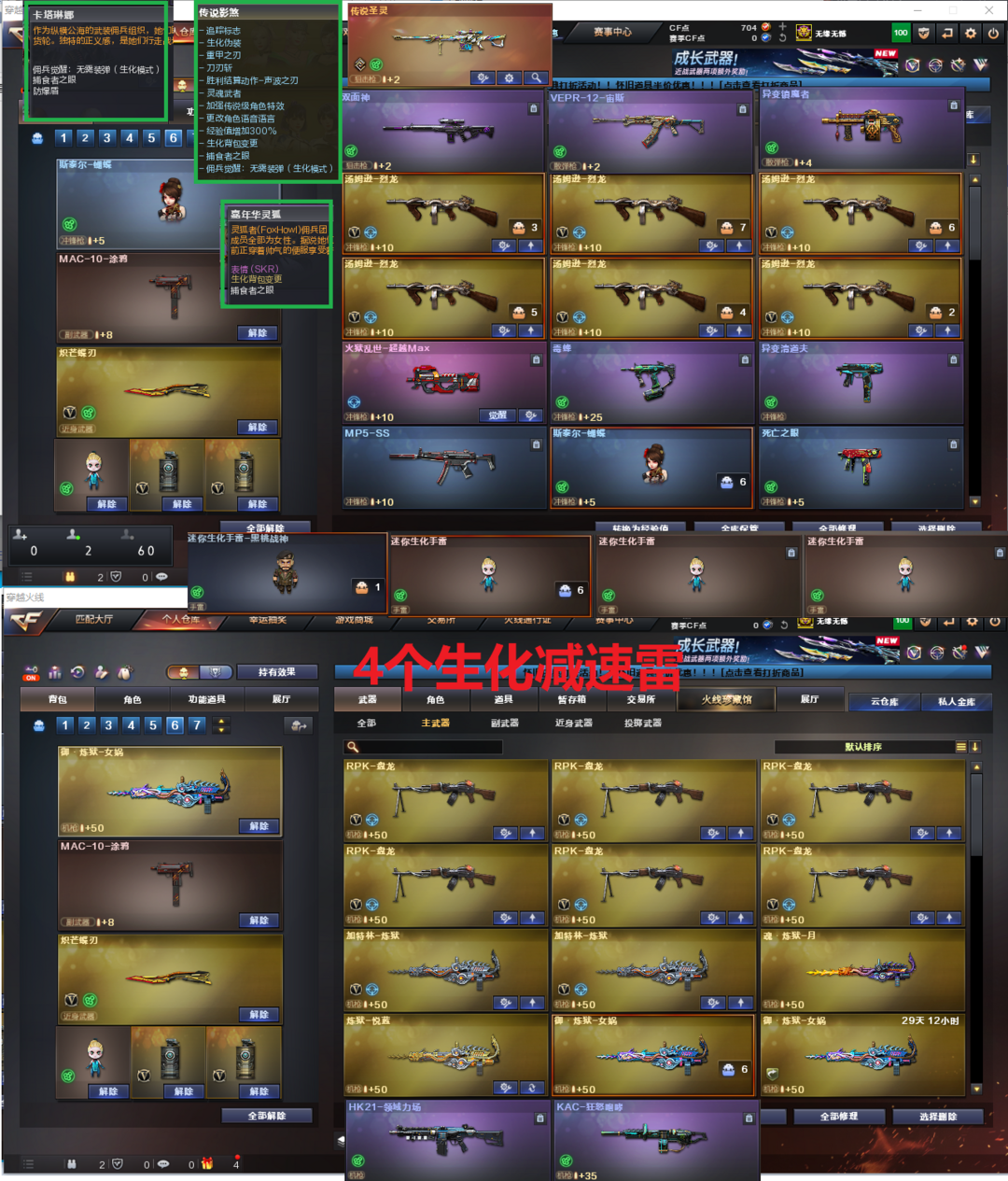 装备描述:排位:可以--------------生化全装(可以变更背包、查看生化僵尸血量):无需换弹6烈、6盘、炼狱、传说圣灵、斯泰尔蝴蝶、毒蜂、VPER-12-宙斯、双面神、异变镇魔者、异变清道夫、双面神、HK21-领域力场、死亡之眼、MAC涂鸦、炽芒蝶刃、4个生化减速雷、、、、、、、、爆破四防:幻神、王者幻神、王者星神、传说破晓、USP雷暴、COP幻灵、冠军之特、白虎、QBZ金色蔷薇、、、白虎音效、火麒麟音效、黑骑士音效、、、2套雷霆、4套雷暴、5套幻灵、1套竞技荣光、1套云龙、1套雷霆王者、、、生化人物(传说影煞、嘉年华灵狐、卡塔琳娜)爆破四防(王者潘多拉、雨墨)