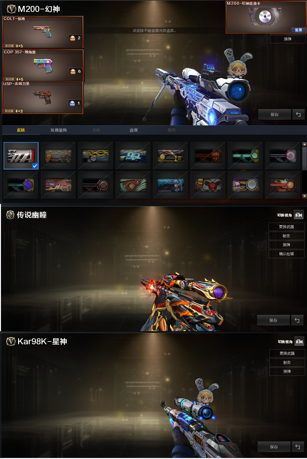 装备描述:排位:可以、、、、、、、、、爆破全装:幻神音效(星耀皮肤)、传说灵眸、98K星神、、、、USP手枪、柯尔特手枪、白虎、QBZ金色蔷薇、、、、幻神音效、裁决音效、极光音效、黑骑士音效、、、2套雷霆王者、1套雷暴王者、、、爆破人物(星际战将)
