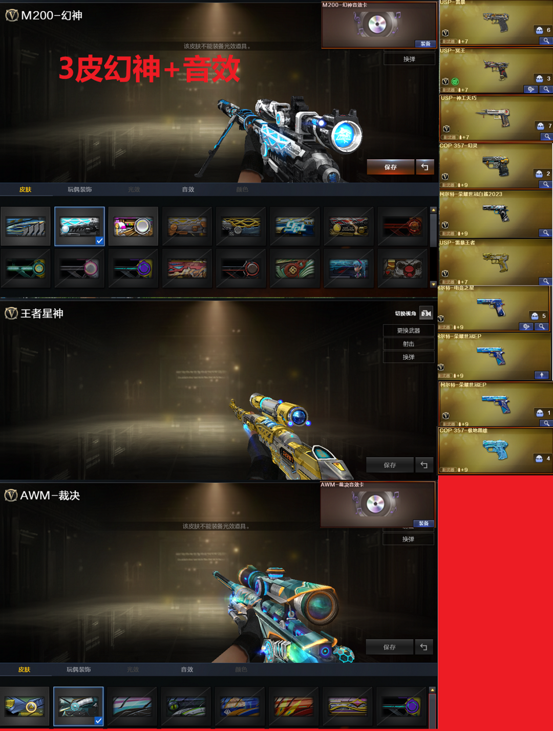 装备描述:排位:可以、、、、、、、、、爆破四防:幻神3皮+音效(23白鲨、电流骇客、动感闪耀皮肤)、王者幻神、王者星神、USP雷暴、USP冥王、USP神工天巧、USP雷暴王者、COP幻灵、23白鲨柯尔特、柯尔特电竞之星、2个EP柯尔特、COP极地、G36幻影、加利尔ACE-天袭、白虎、王者 白虎、QBZ金色蔷薇、QBZ王者蔷薇、、、幻神音效、裁决音效、毁灭音效、火麒麟音效、黑骑士音效、、、2套幻灵、2套神工天巧、2套玄豹、3套雷霆王者、2套雷霆王者、、、爆破四防(王者潘多拉、王者魅影)