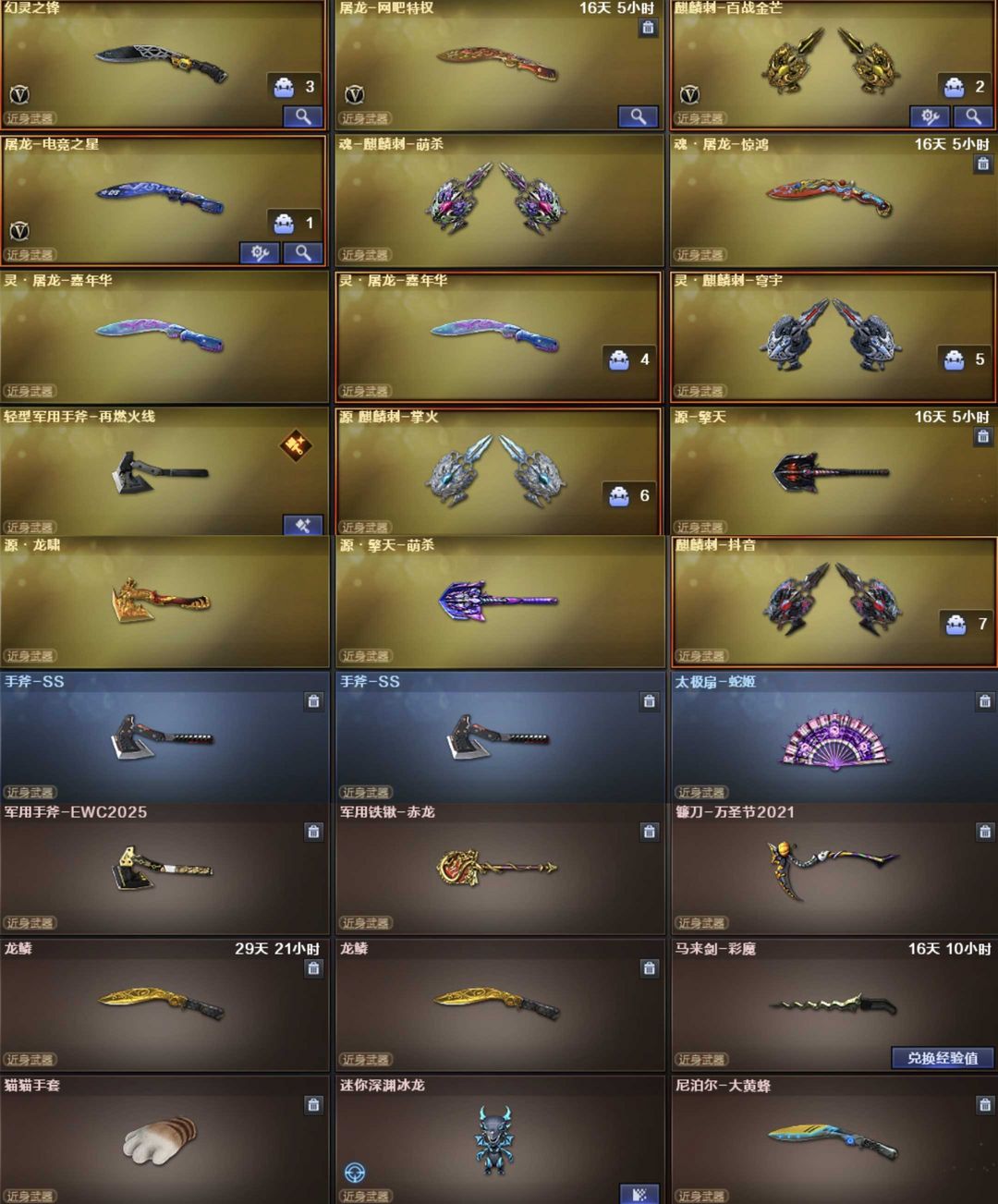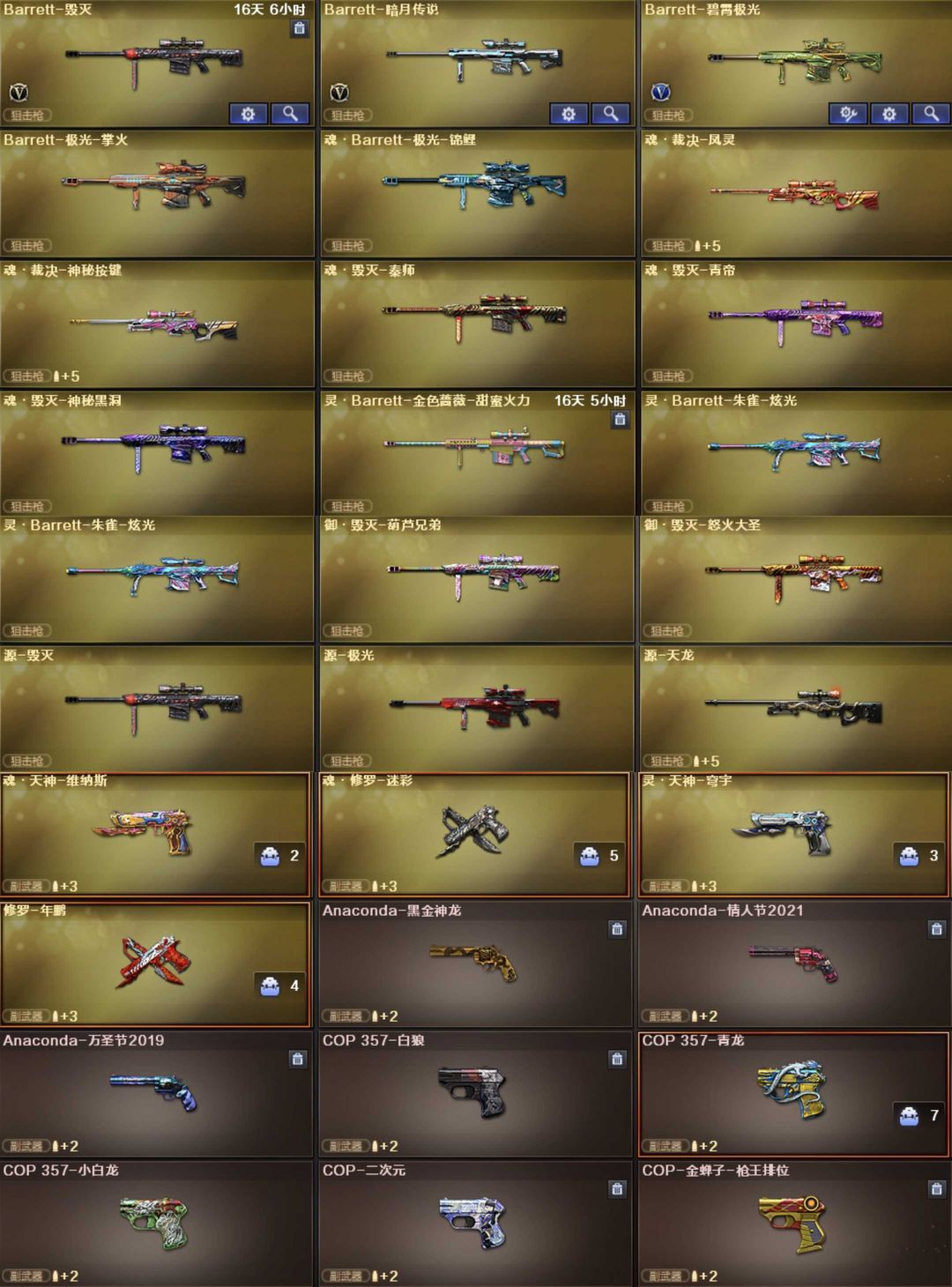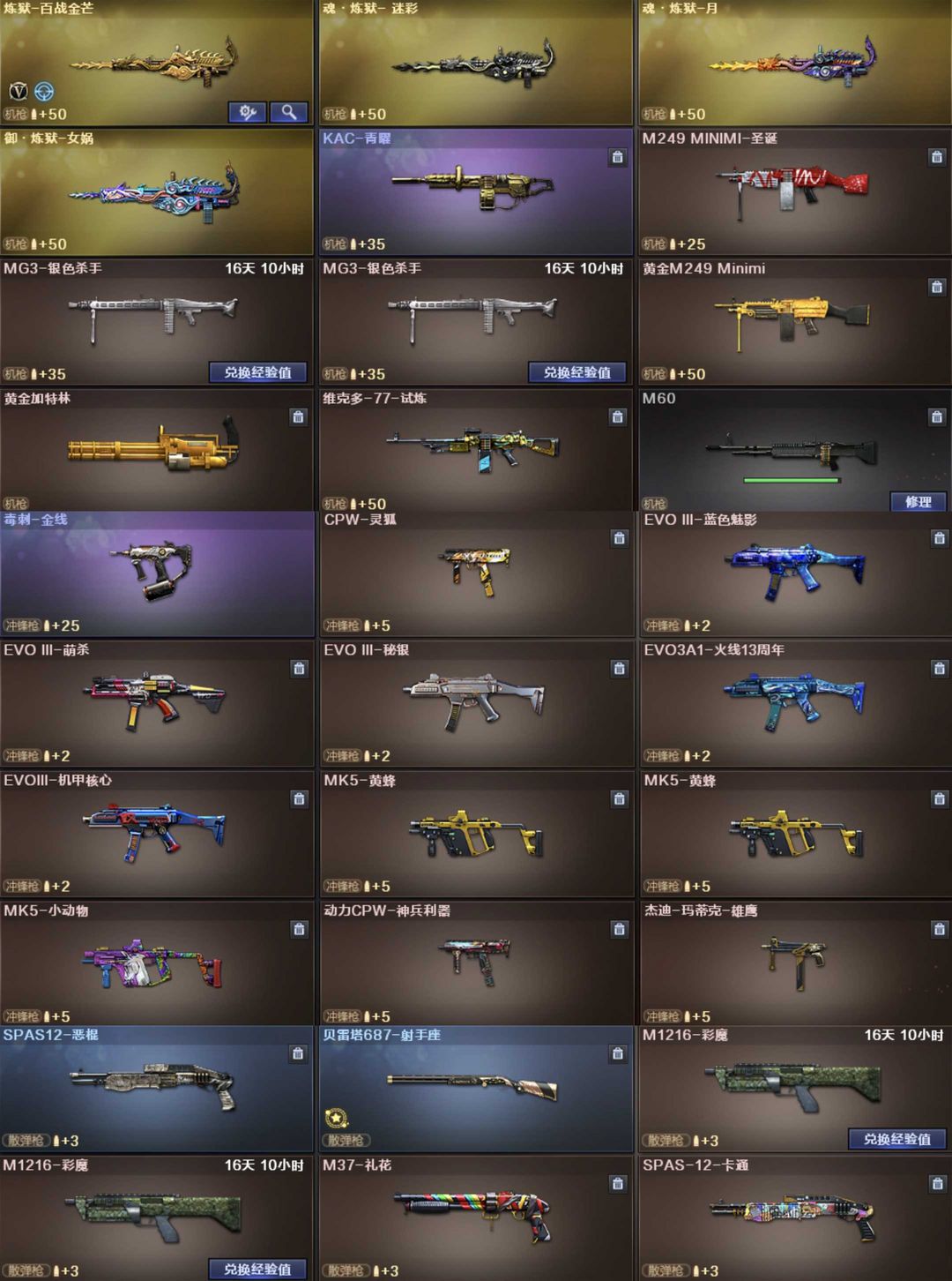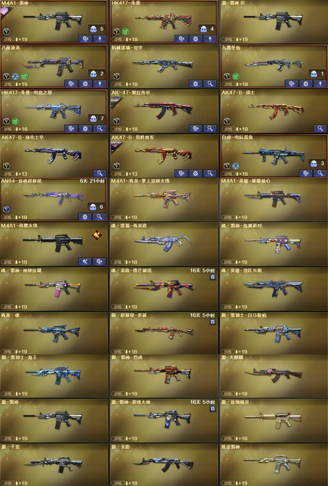 装备描述:英雄武器189个; 王者武器12个。 可以玩爆破号、生化号 狙:传说幽瞳,2把幻神(巅峰荣耀,白鲨、电流骇客,N9,冠军幻,宠儿,CF22),星神(AG冠军),极光,裁决(异化之源、流光),天龙,毁灭,金蚀,孙三炮、王者星霆,王者风神,王者之光 步枪:G36幻影、传说辉光,白虎(AG冠军,电玩,霓虹)白虎魄,青龙,青龙魄,朱雀,玄武,蔷薇(破浪逐光),云龙全套,雷神,黑骑士,死神,黑武士,天启,迷城,雷霆,烈火动感,王冰魄,王雷影,王芳薇,王势翼心鲨烈,王风势,炫金骑士黑龙。 2盘3炼狱小刚,6烈蝴蝶,炽火炎龙,A12雷霆。 副武器:传说破晓,2COP幻灵COP雷霆云龙白鲨,USP 雷暴天巧,柯尔特(荣耀世冠,冠军,无冕),王者枪刃。 近战:2蝶刃,2屠龙,4麒麟刺,2擎天,屠龙动感,龙啸奇洋,擎天竞技,斩神刀,幻灵锋。 幻灵雷套,雷霆王者雷套,2竞技雷套,8雷暴雷套,5雷霆雷套,7天巧雷套。 音效:幻神裁决极光毁灭白虎朱雀玄武蔷薇天罚雷神火麒麟。 角色:传说影煞艾丽莎,毒蝰术士,关小雨,机械师,晴雅,隼,炫,,鹰,蛇影踪,王者潘多拉,奇洋探员,便宜教练,云海玲珑,王者玲珑。