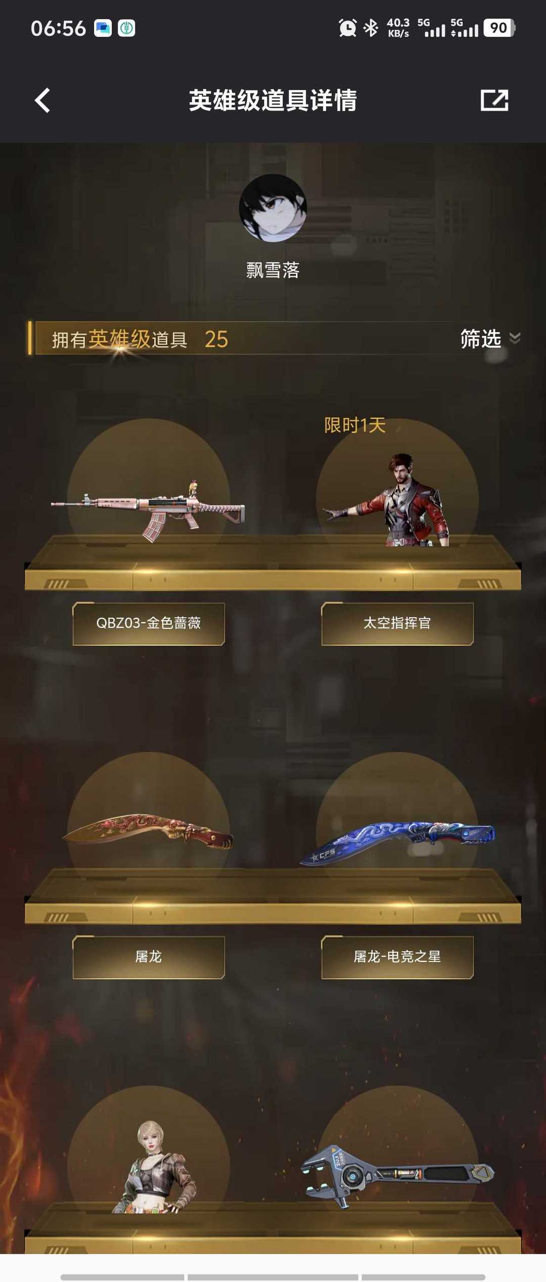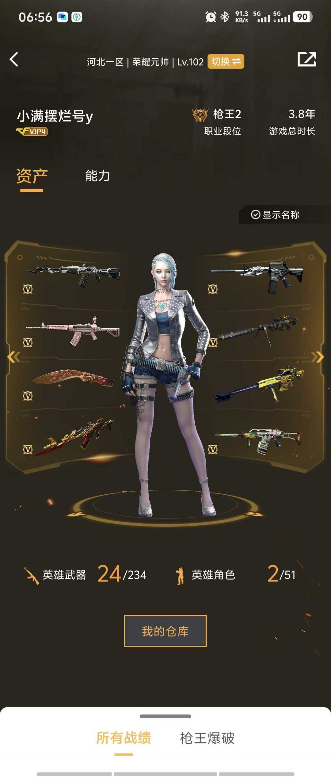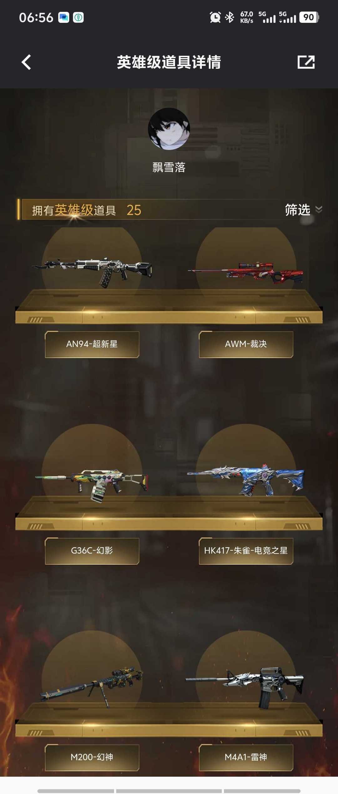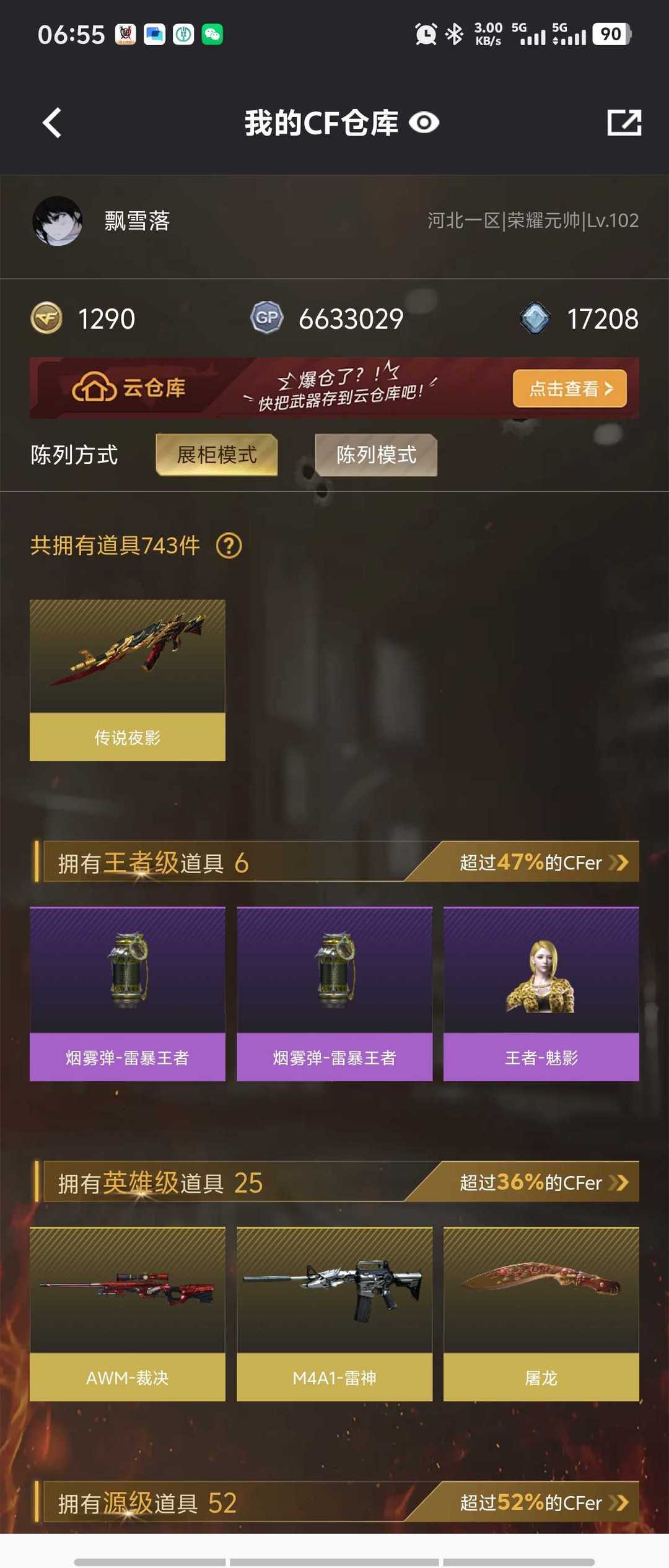 装备描述:【重要角色】王者-魅影/电竞少女/铁骑荣耀 【传说武器】传说夜影 【英雄武器】M200-幻神/G36c幻影/M4A1-雷神/QBZ03-金色蔷薇/屠龙/高爆手雷-云龙/闪光弹-竞技荣光/黑武士-锦绣游龙 /AWM裁决 【王者武器】王者之城/王者星光/王者蔷薇 【重要武器皮肤】毁灭-百城浙江 皮肤/M4A1-雷神-白鲨皮肤/黑骑士-AG-S4冠军典藏/QBZ03-巅峰荣耀皮肤 /裁决运输船皮肤➕裁决音效卡/幻影逐浪皮肤 目前段位枪王可以排位
