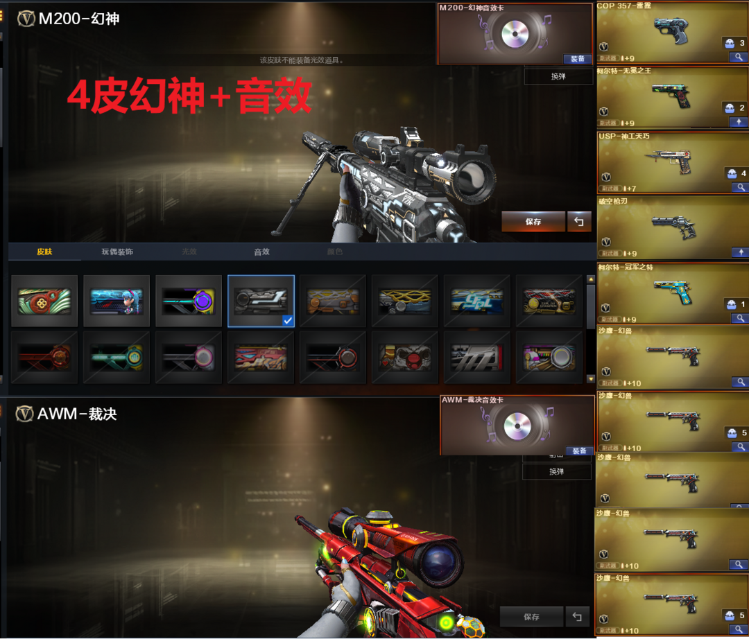 装备描述:排位:可以、、、、、、爆破四防:幻神4皮+音效(YZK、巅峰荣耀、白鲨、降龙皮肤)、USP神工天巧、COP雷霆、柯尔特-无冕之王、冠军之特、破空枪刃、5个幻兽沙鹰、、、、、传说圣灵、传说暗裔、QBZ幻兽、白虎、QBZ金色蔷薇、、、幻神音效、裁决音效、蔷薇音效、毁灭音效、黑骑士音效、、、5套幻兽、7套雷霆、1套神工天巧、、、爆破四防(传说女帝、王者沙漠玫瑰)