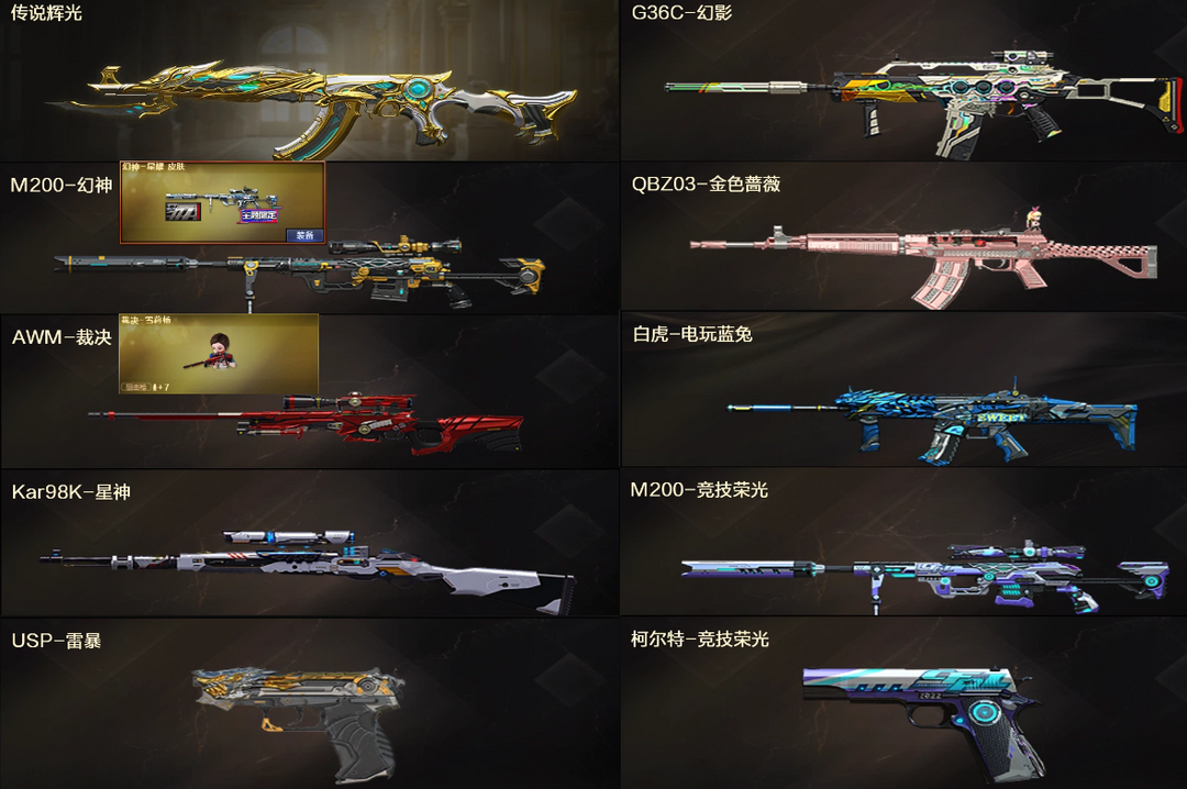 传说辉光❤幻神星耀皮❤星神裁决幻影白虎QBZ蔷薇竞技荣光套❤USP雷暴柯尔特❤4防王者貂蝉4防云悠悠