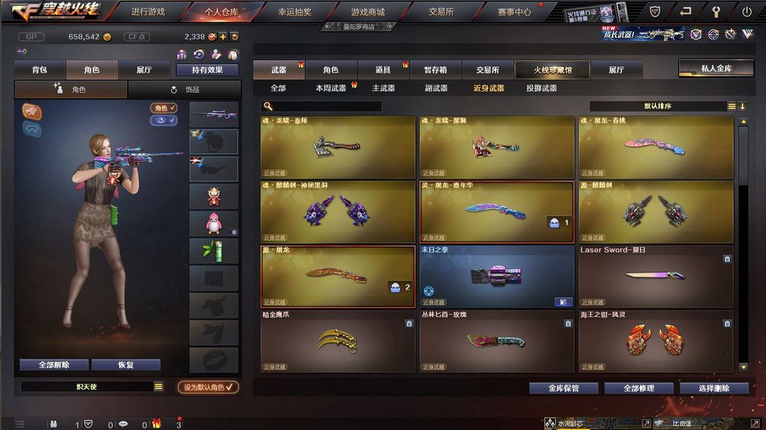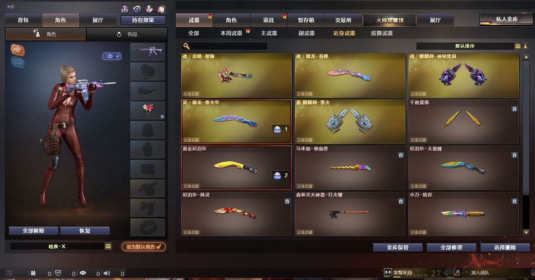 宗师2/柯尔特无冕之王/雷神/毁灭/屠龙/ 修罗/ 火麒麟/黑骑士/炼狱/喷子 主流武器都有。可排位