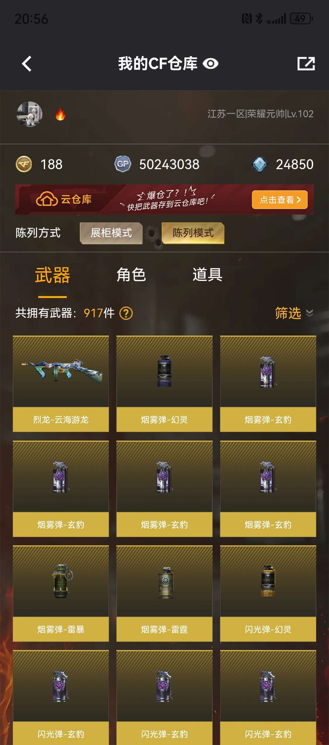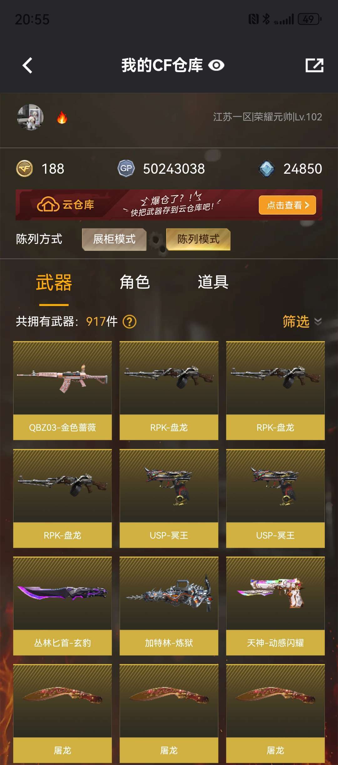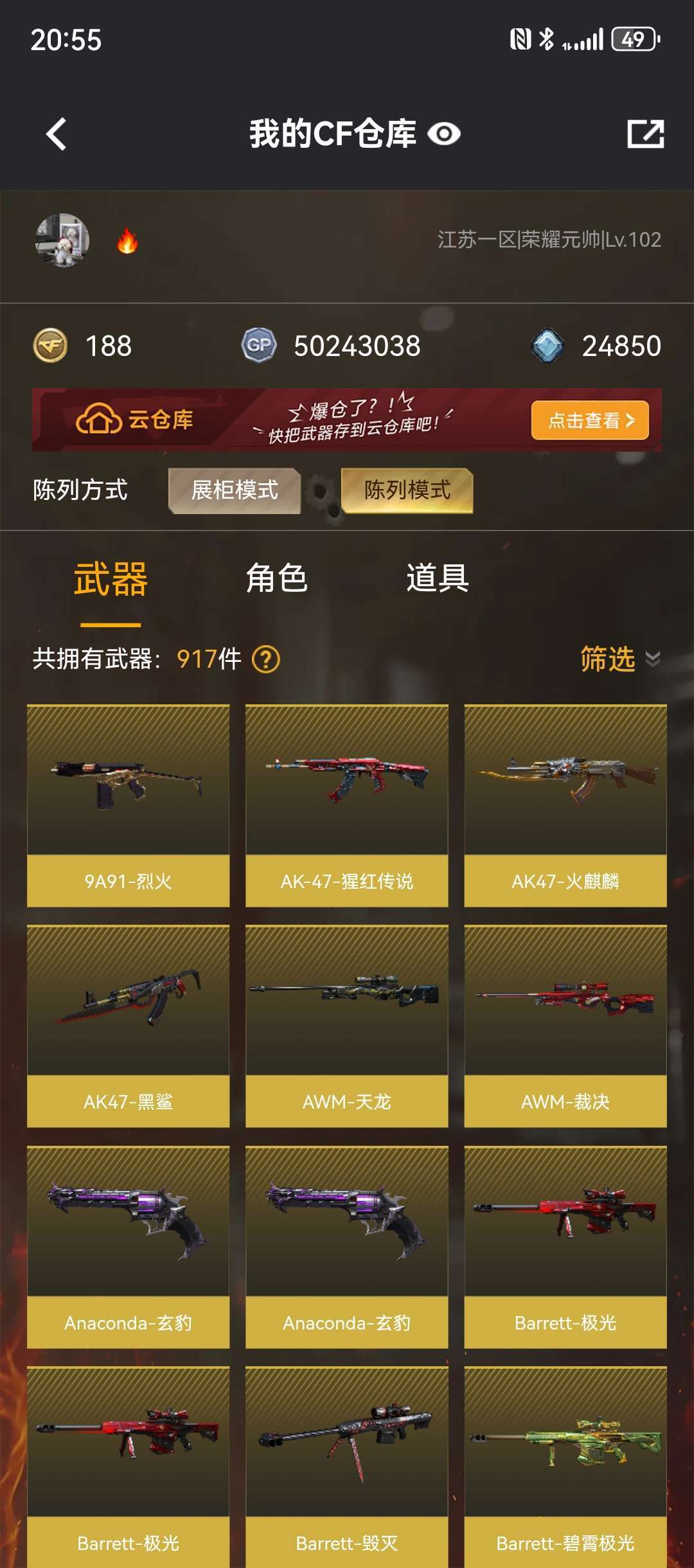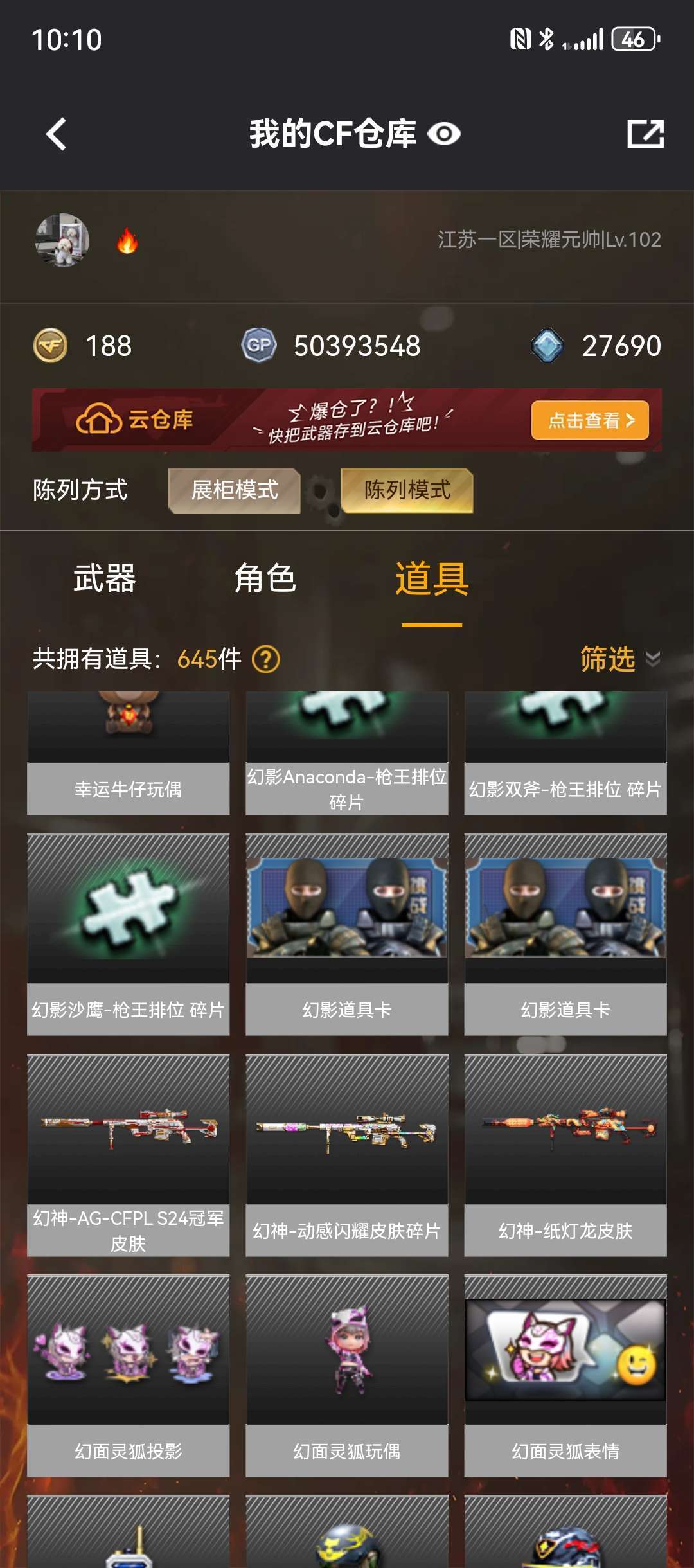 装备描述:全装号白虎九尾/幻神AG皮肤加音效卡/QBZ皮肤白鲨世冠拼搏/冥王usb两把雷霆cop/毒蜂两把玄武/四防角色/生化专用角色/雷霆手雷/雷暴手雷/玄爆手雷四套