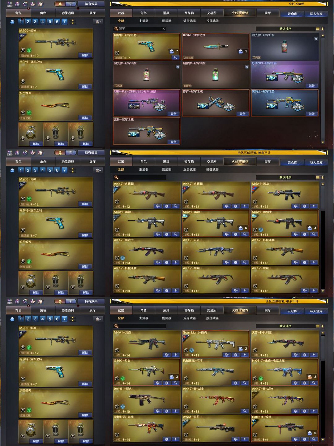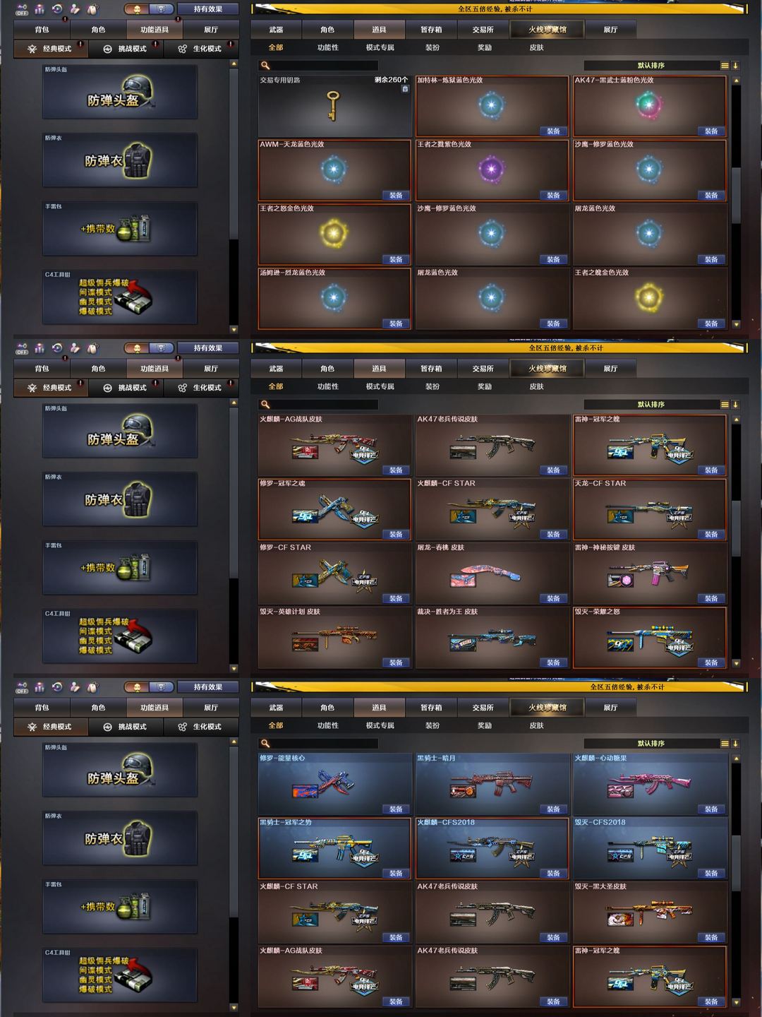 装备描述:幻神KZ冠军薇特刃✨炽芒蝶刃G36幻影带卡✨裁决三件套白虎拼搏✨10音效卡全赛事皮✨满副手全道具
