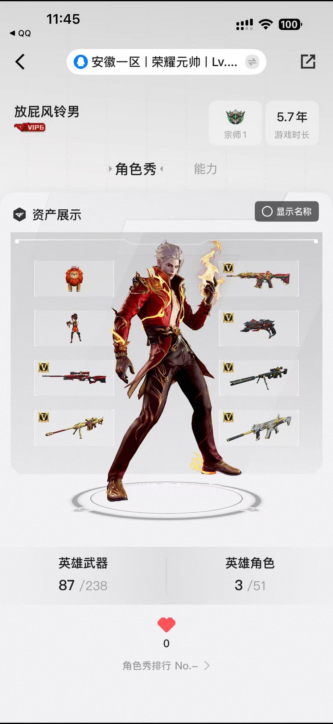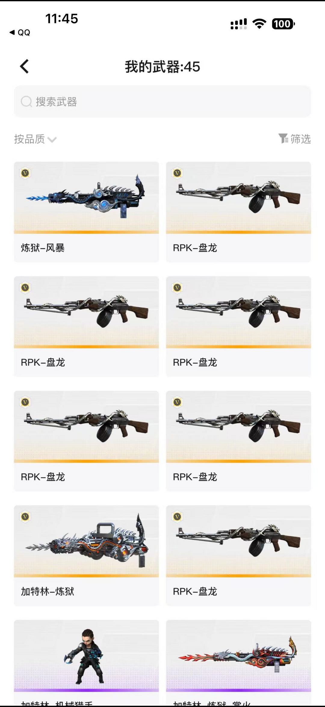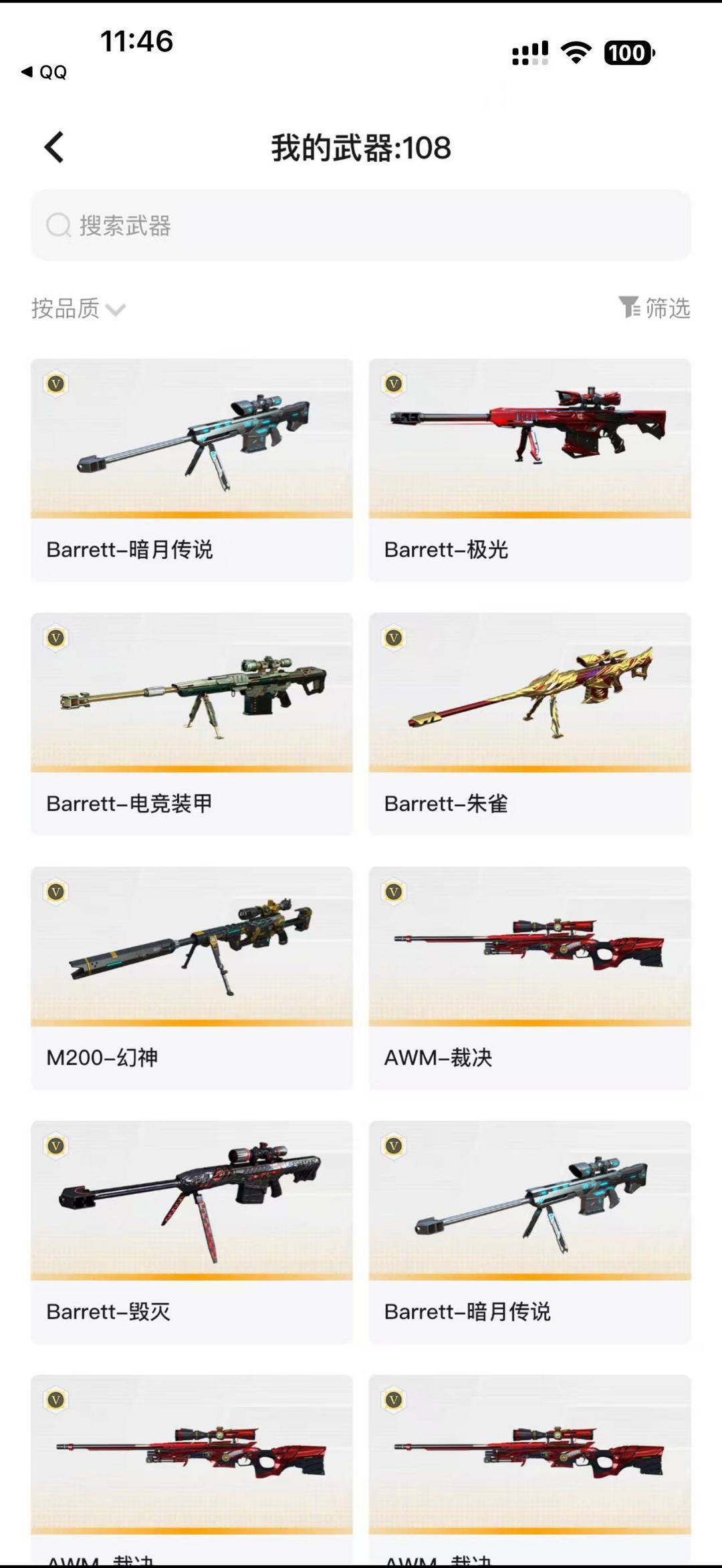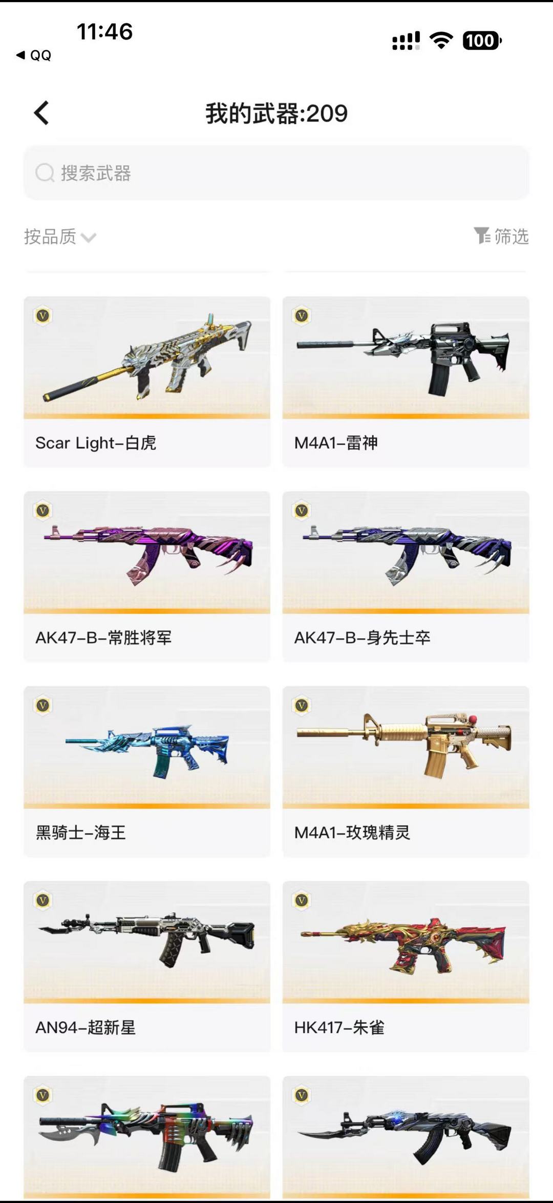 装备描述:王者武器:闪光弹-雷霆王者-觉醒版;王者之魄-觉醒版;王者星神-觉醒版;王者之怒-觉醒版;王者之击-觉醒版;王者之啸-觉醒版 英雄武器:AK-47-猩红传说;Barrett-暗月传说;机械迷城-穹宇;白虎-电玩蓝兔;擎天-CF网剧冠军;沙鹰-天神;炼狱-风暴;Barrett-极光;Scar Light-白虎;M4A1-雷神;AK47-B-常胜将军;AK47-B-身先士卒;黑骑士-海王;麒麟刺;龙啸;Barrett-电竞装甲;破空枪刃-夜魔;尼泊尔-电竞装甲;柯尔特-电竞装甲;Barrett-朱雀;斩神刀-雷暴;M4A1-玫瑰精灵;AN94-超新星;擎天;RPK-盘龙;沙鹰-修罗;马来剑-夜魔;HK417-朱雀;M200-幻神;M4A1-千变;AK47-无影;屠龙;AWM-裁决;加特林-炼狱;QBZ03-金色蔷薇;AK47-黑鲨;M4A1-黑龙;汤姆逊-烈龙;Barrett-毁灭;龙啸-堕天神;麒麟刺-堕天神;AK47-火麒麟;AK47-B-战神;AK47-B-战士;AA-12-雷霆;M4A1-黑骑士 角色:迷迭香;沙漠玫瑰;神威莲华;猎狐者;刀锋;潘多拉;幻影;堕天使;活力灵狐;兰;威