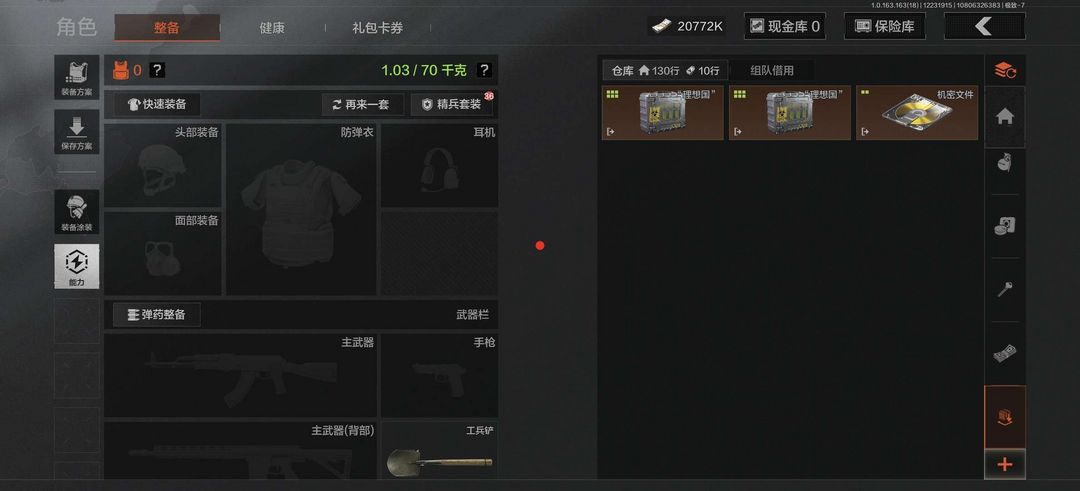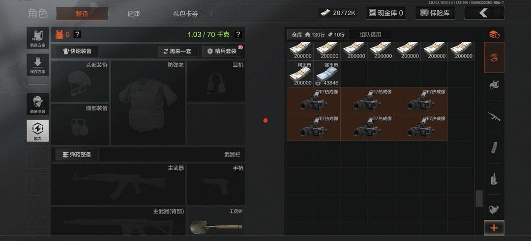 装备描述:20000k纯币绝对够用,仓库还有各种枪械和6个t7,两个理想国和一张机密希望不要卖