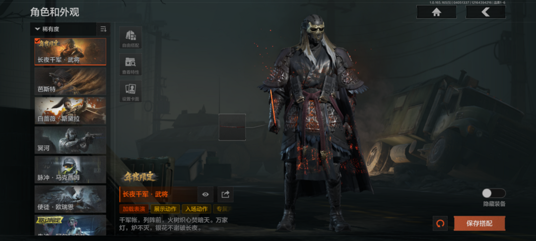 装备描述:30级,历史最高段位:暗区传说,【角色皮肤】:长夜千军武将,芭斯特,白蔷薇斯黛拉,冥河,脉冲马克西姆,使徒欧瑞恩,朱迪阿尔瓦雷兹,火绒塔莉娅,深潜行者II,机车朋克战衣,长夜千军十夫长作战套装,和平先锋作战套装,财团之手作战套装,暴恐机动队外勤服饰,都市夜影套装;【近战武器】:赤火炉心,百炼恒常,苍穹利爪,收割者,S-07折刀,赢家匕首,热能武器补牢,不屈烈怒,盘牙彻甲短刃,下弦月,工兵铲,来战开山刀;【手套】:冬日手套;【突击步枪】:包络战术AKM,竞技风潮M4A1,地脉深处FAL,伦琴幻影FAL,镀火熔金H416,蓝色咆哮H416,冰河碎影AUG,告丧夜曲AR57,百锻铁骑AEK,战术大师AEK,旗帜AEK,银月AN94,旧王圣谕QBZ191,乌金黑曜QBZ192,和平先锋AKM,骑士之剑AKM,棱光裂变AKM,来战AKM,潜渊蛇鳞M4A1,骤羽尖啸M4A1,幻域莎绫M4A1,和平之手FAL,自喷网格H416,竞技MDR,北国内卫MDR,棱光裂变AK102,包络战术AK74N,战术大师AK74N,棱光裂变AK74N,骑士之剑AKS74U,火力倾泻AUG,火绒草AUG,战术大师F20